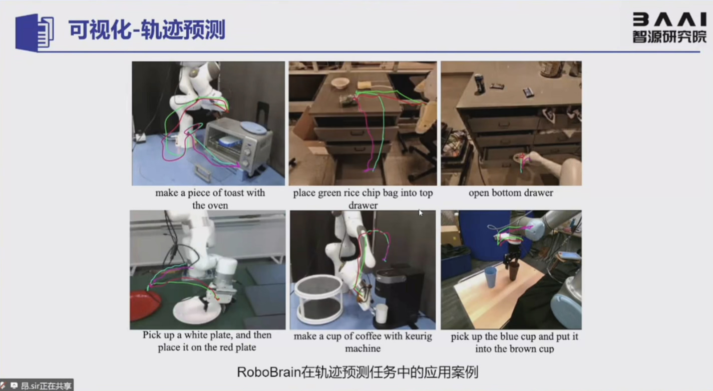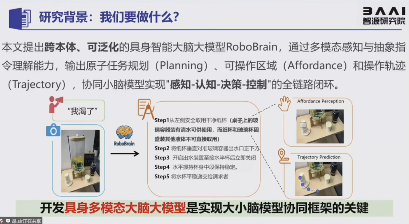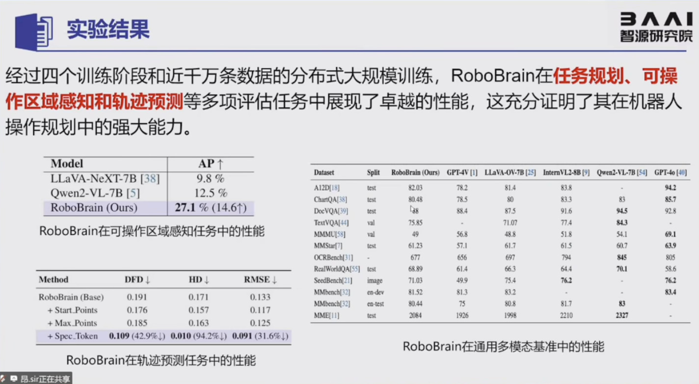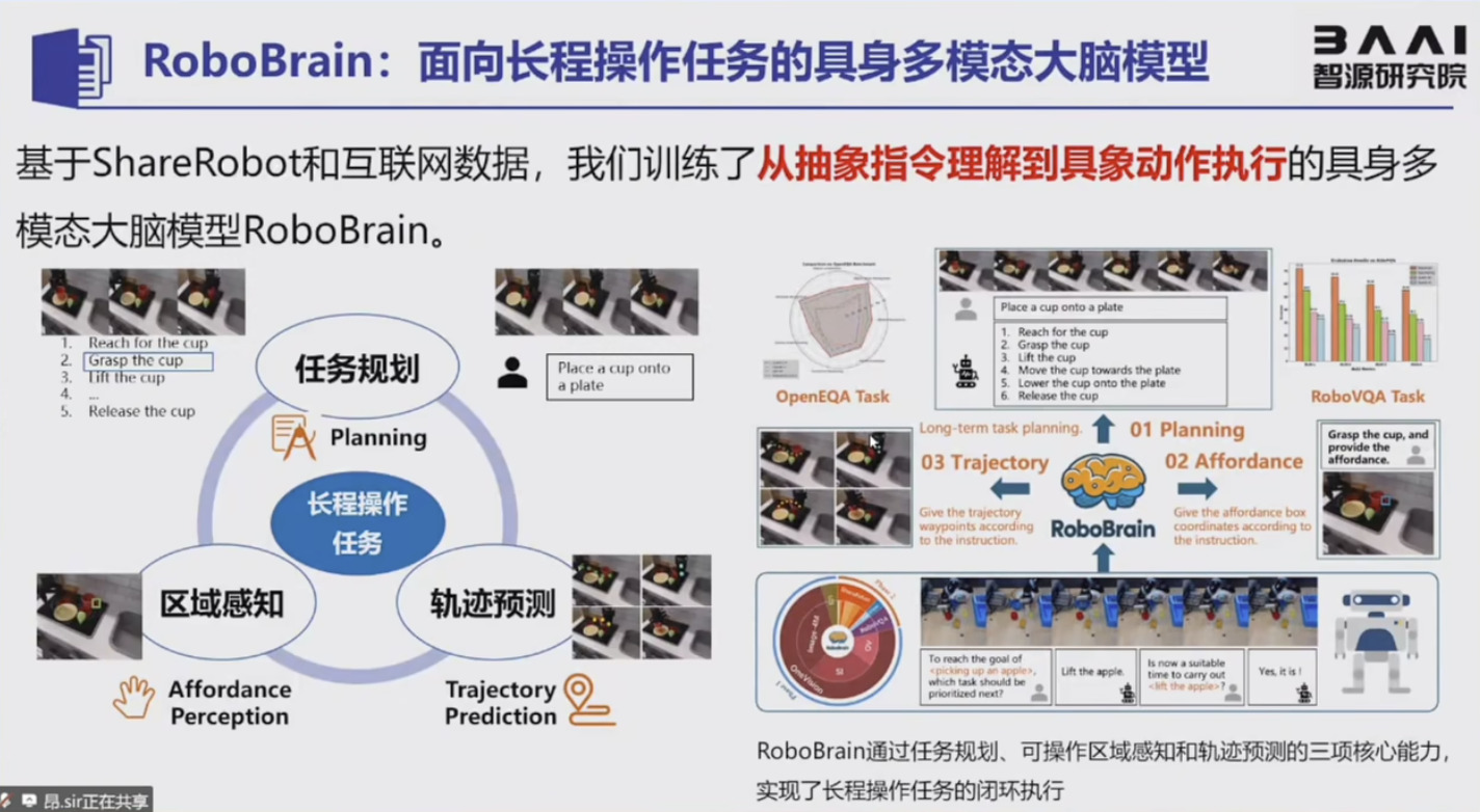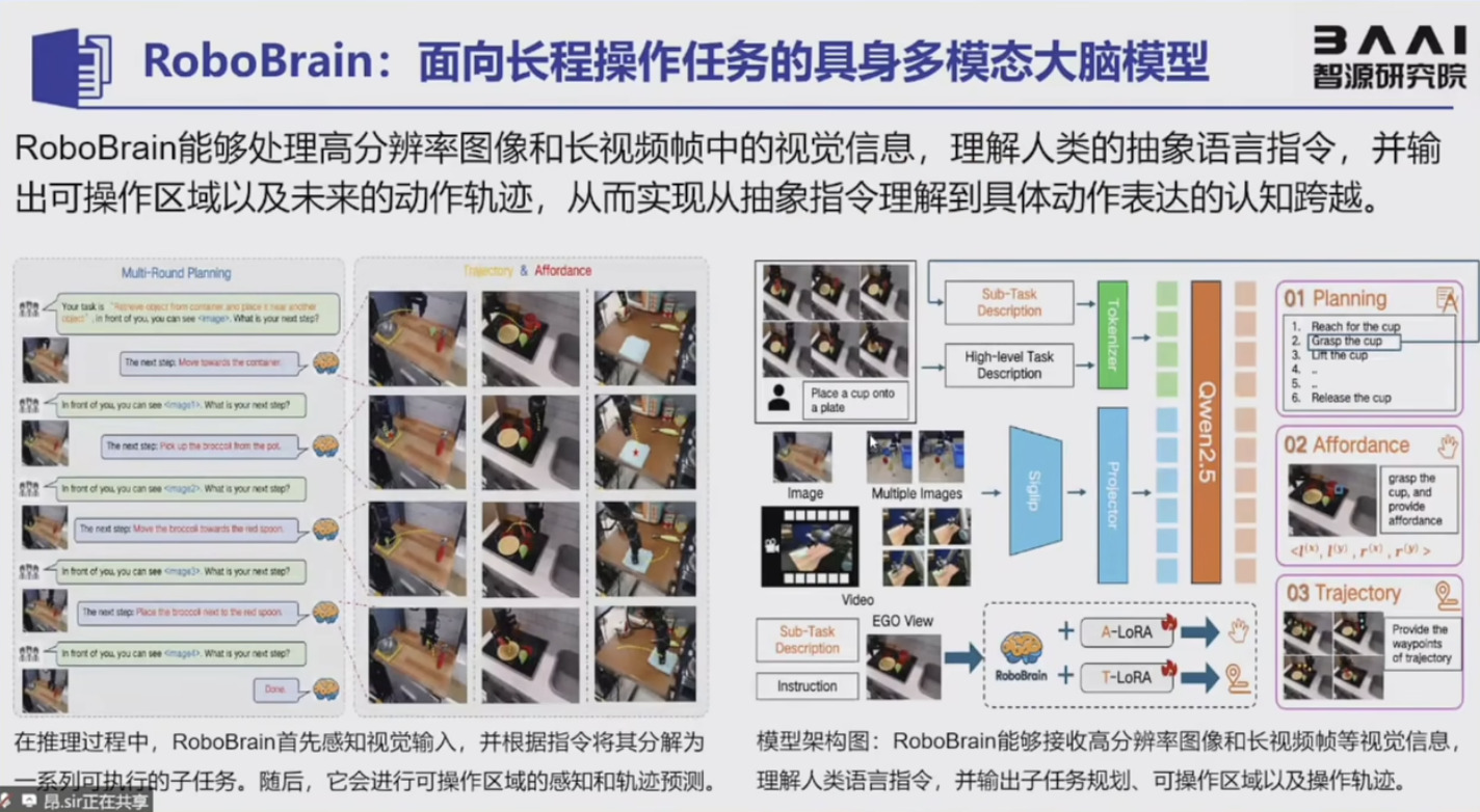 本文档介绍了RoboBrain,一个由智源人工智能研究院开发的具身多模态大模型。它详细阐述了具身人工智能的发展趋势,并强调了大型模型在复杂长期操作任务中的重要性。文件中解释了任务规划、可操作区域感知和轨迹预测是RoboBrain实现端到端具身智能的关键能力。此外,它还介绍了用于训练RoboBrain的ShareRobot数据集,以及模型训练策略和实验结果,展示了RoboBrain在各项基准测试中超越现有模型的表现。