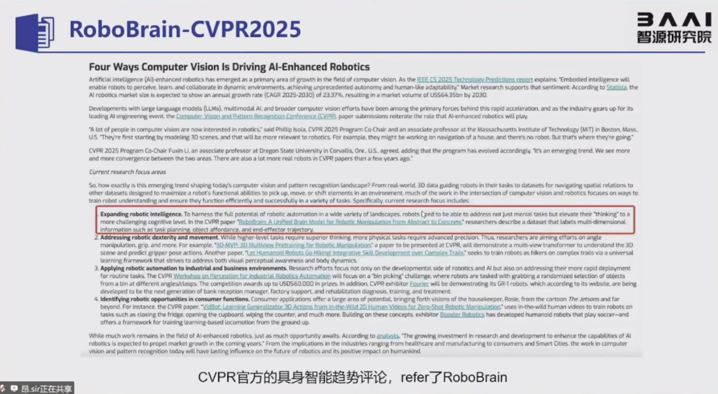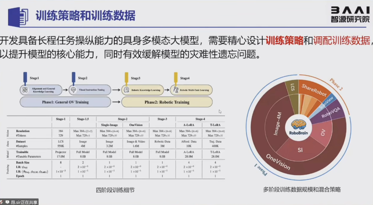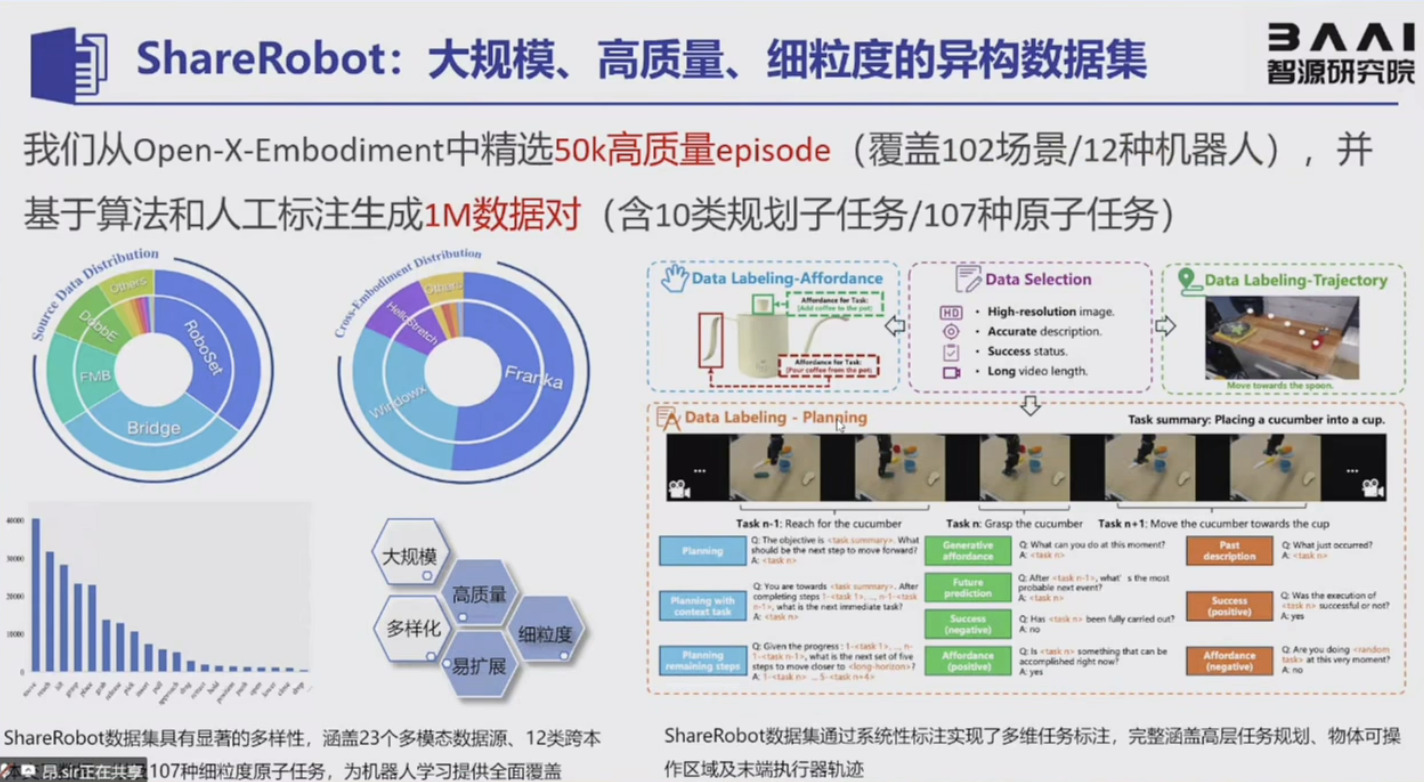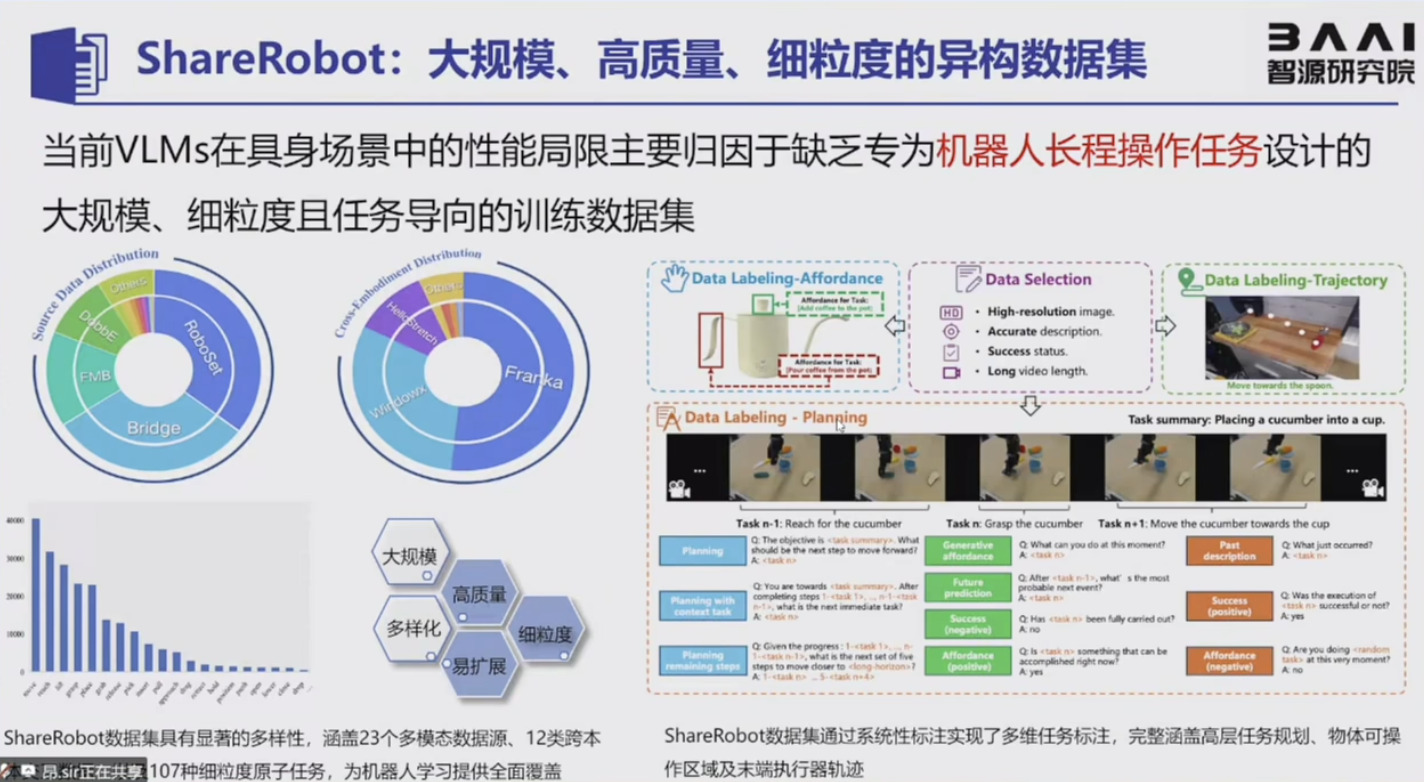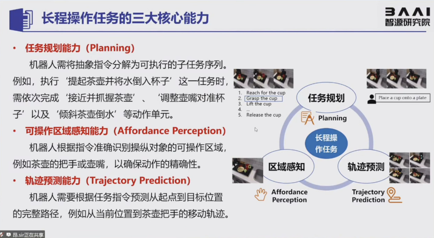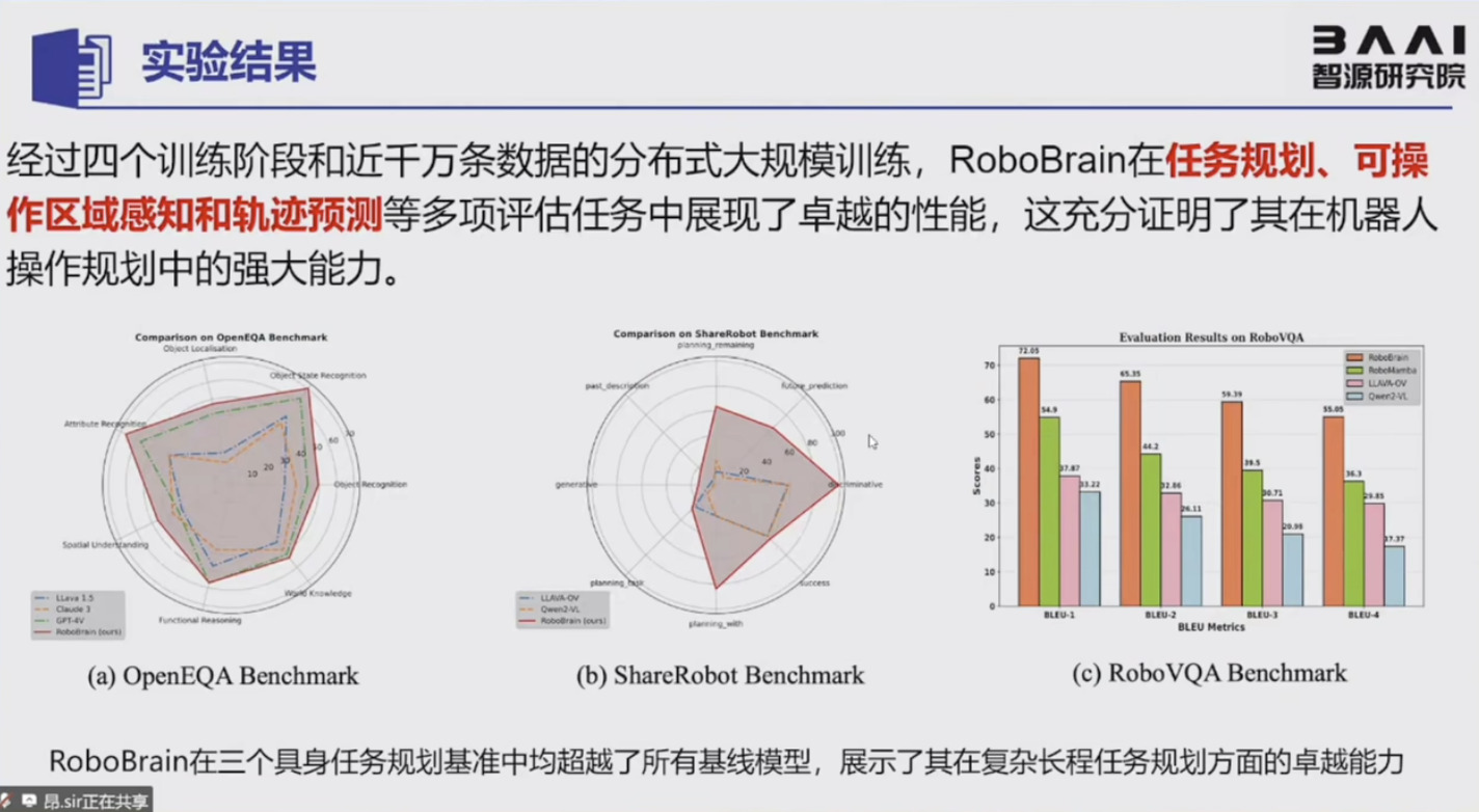 本文档介绍了RoboBrain,一个由智源人工智能研究院开发的具身多模态大模型。它详细阐述了具身人工智能的发展趋势,并强调了大型模型在复杂长期操作任务中的重要性。文件中解释了任务规划、可操作区域感知和轨迹预测是RoboBrain实现端到端具身智能的关键能力。此外,它还介绍了用于训练RoboBrain的ShareRobot数据集,以及模型训练策略和实验结果,展示了RoboBrain在各项基准测试中超越现有模型的表现。