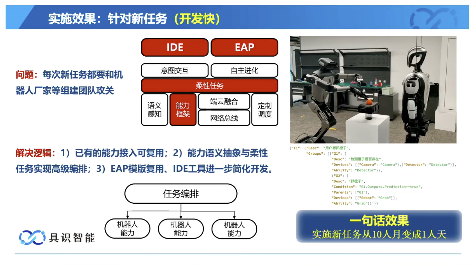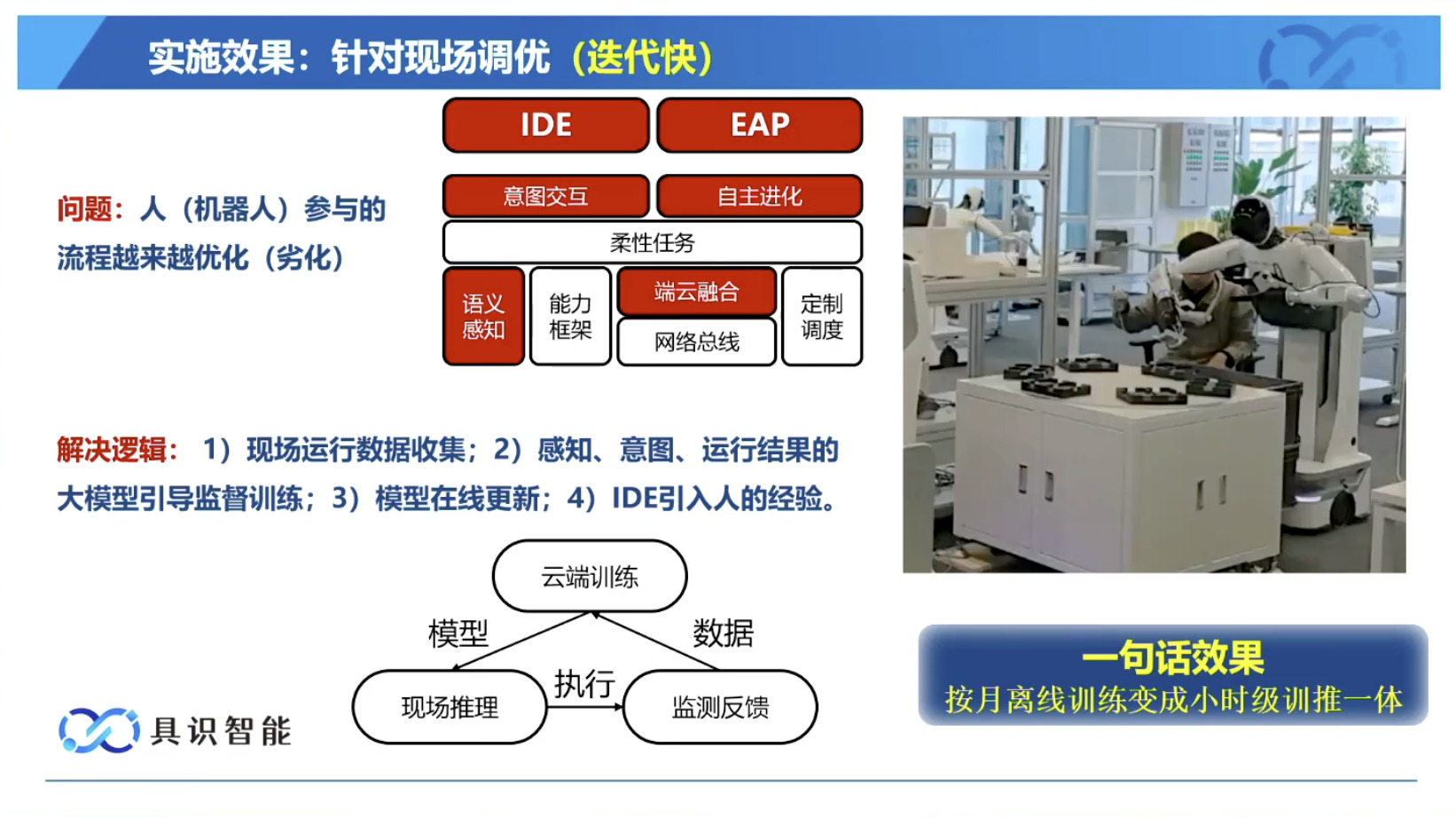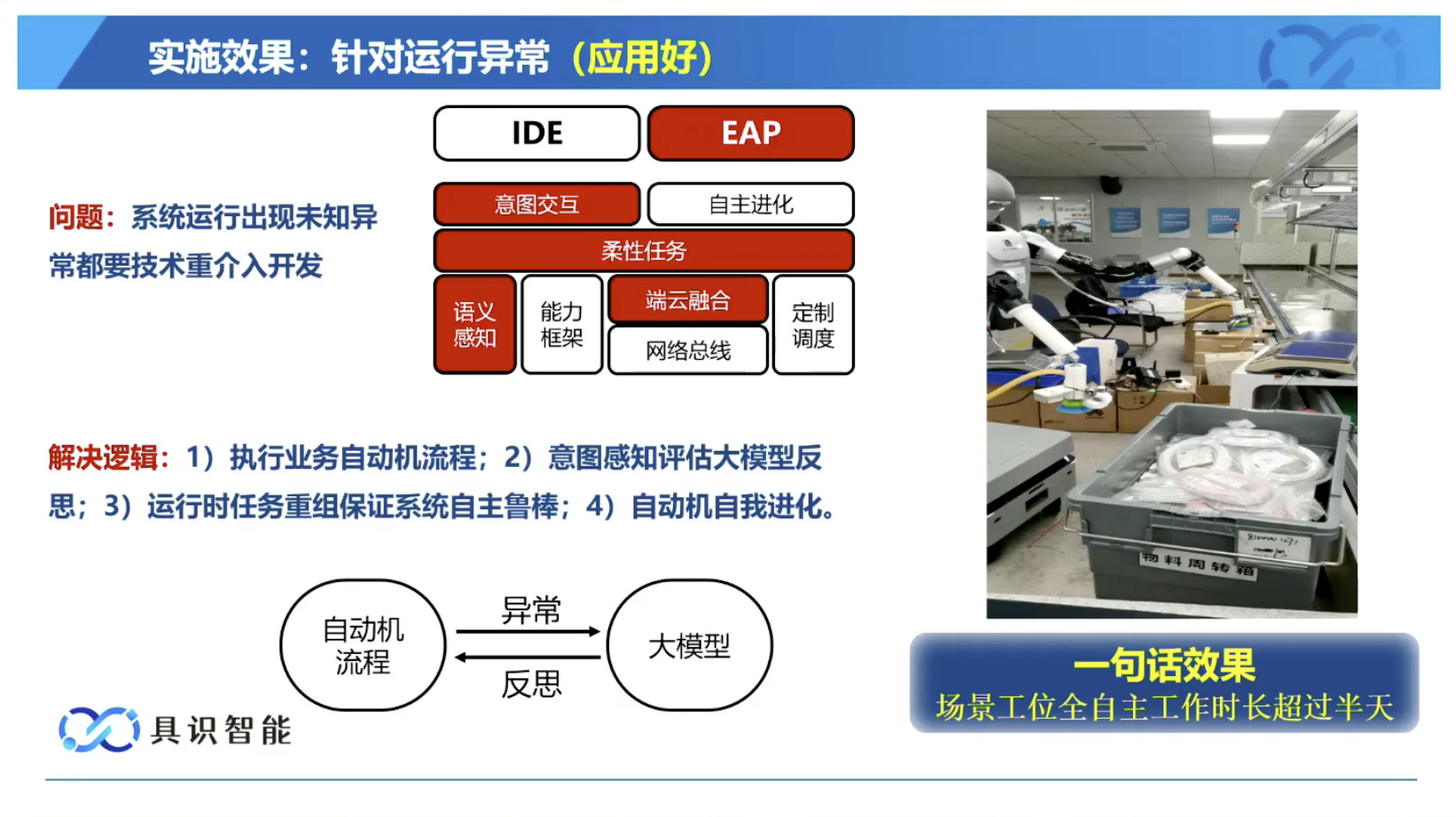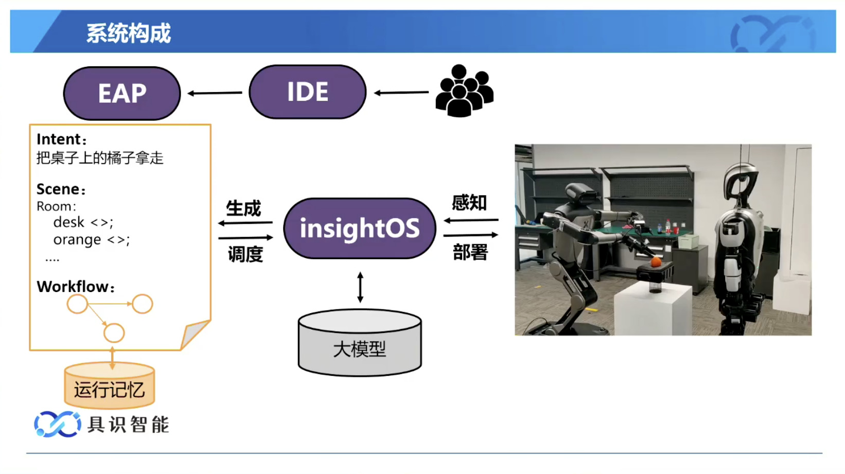 幻灯片概述了具识智能(Insight Robotics)公司研发的机器人智能操作系统 InsightOS。内容涵盖了该操作系统的背景意义、产品形态、关键技术及其应用示范。幻灯片着重介绍了 InsightOS 作为具身智能代理(EAP)与集成开发环境(IDE)结合的架构,并将其与安卓系统进行了对比,强调了其在制造业和家庭场景智能化的优势。此外,还展示了 InsightOS 在提高开发效率、处理运行异常和优化现场调度方面的实际效果,并提供了已适配的多种机器人型号清单。