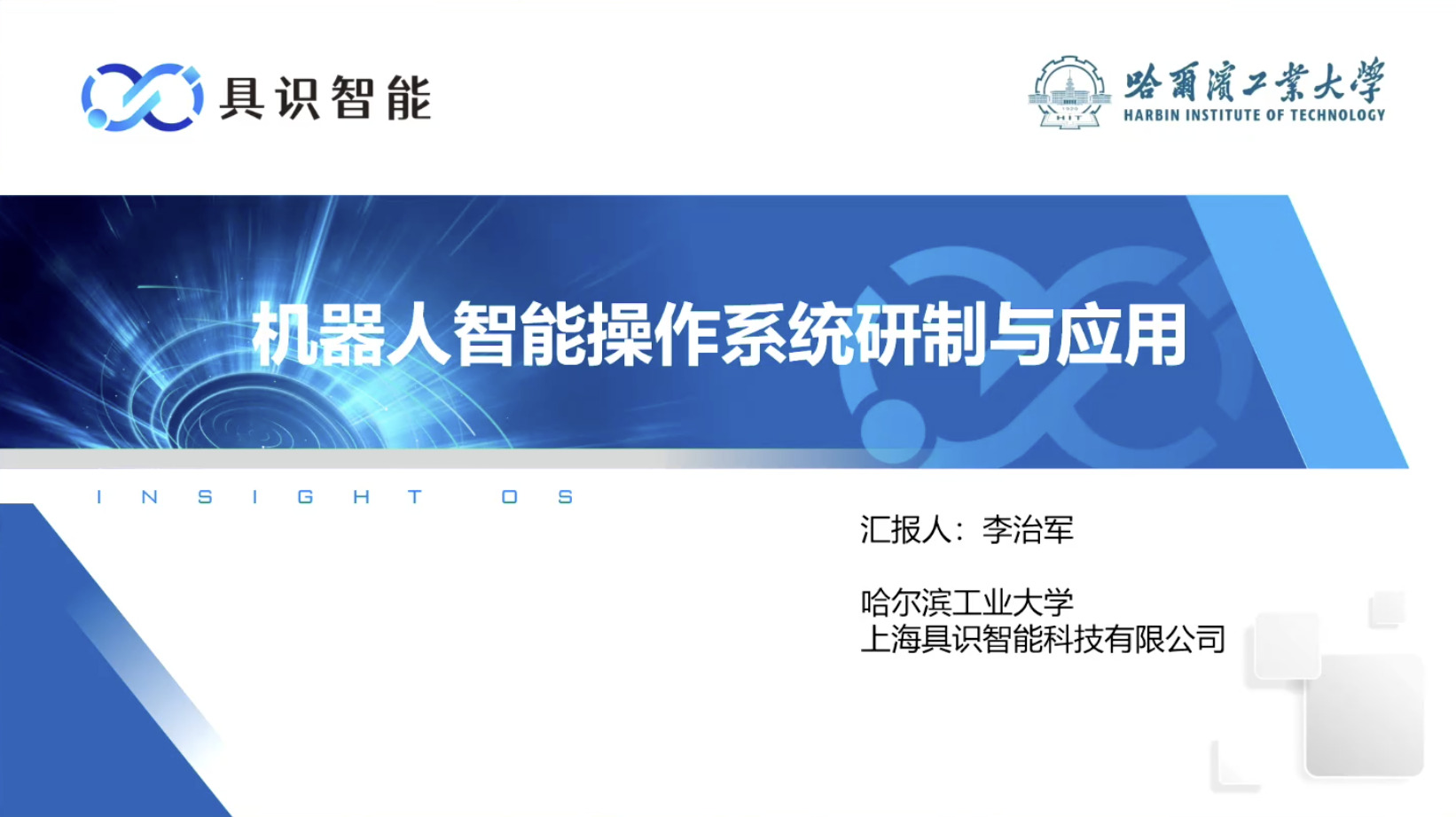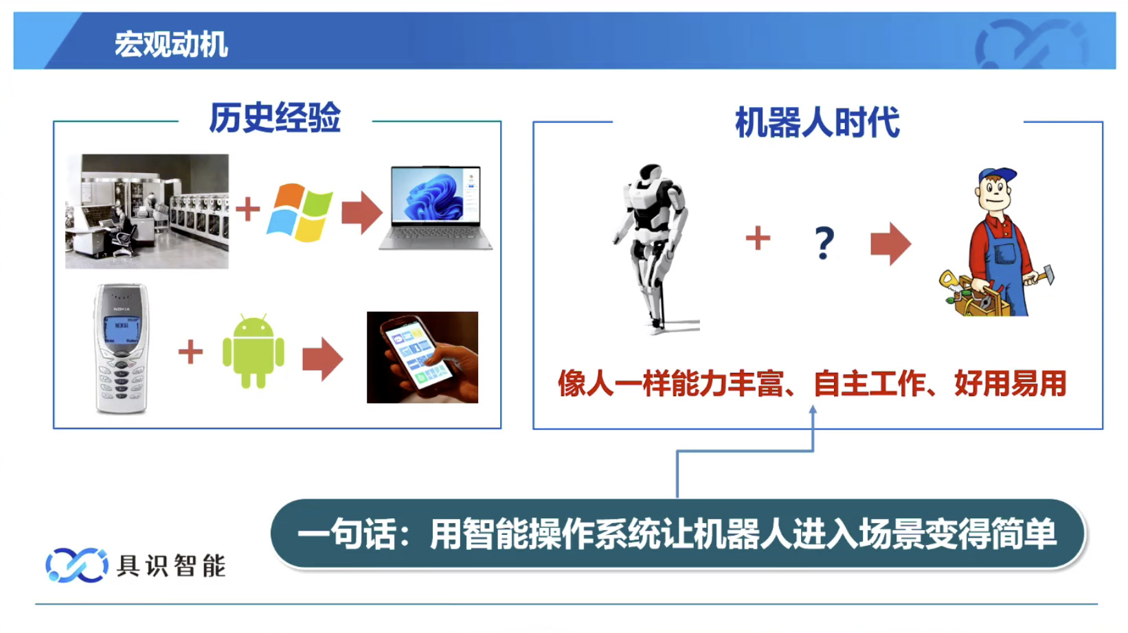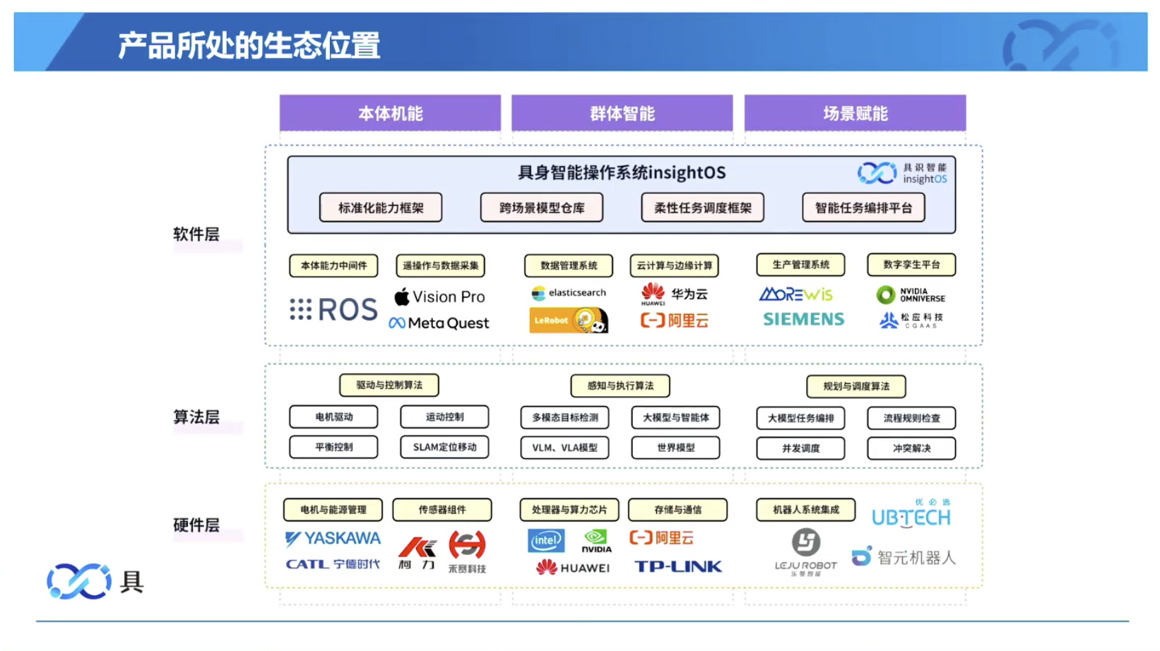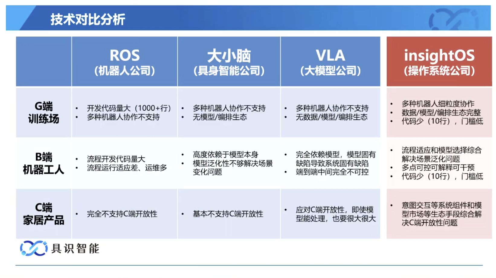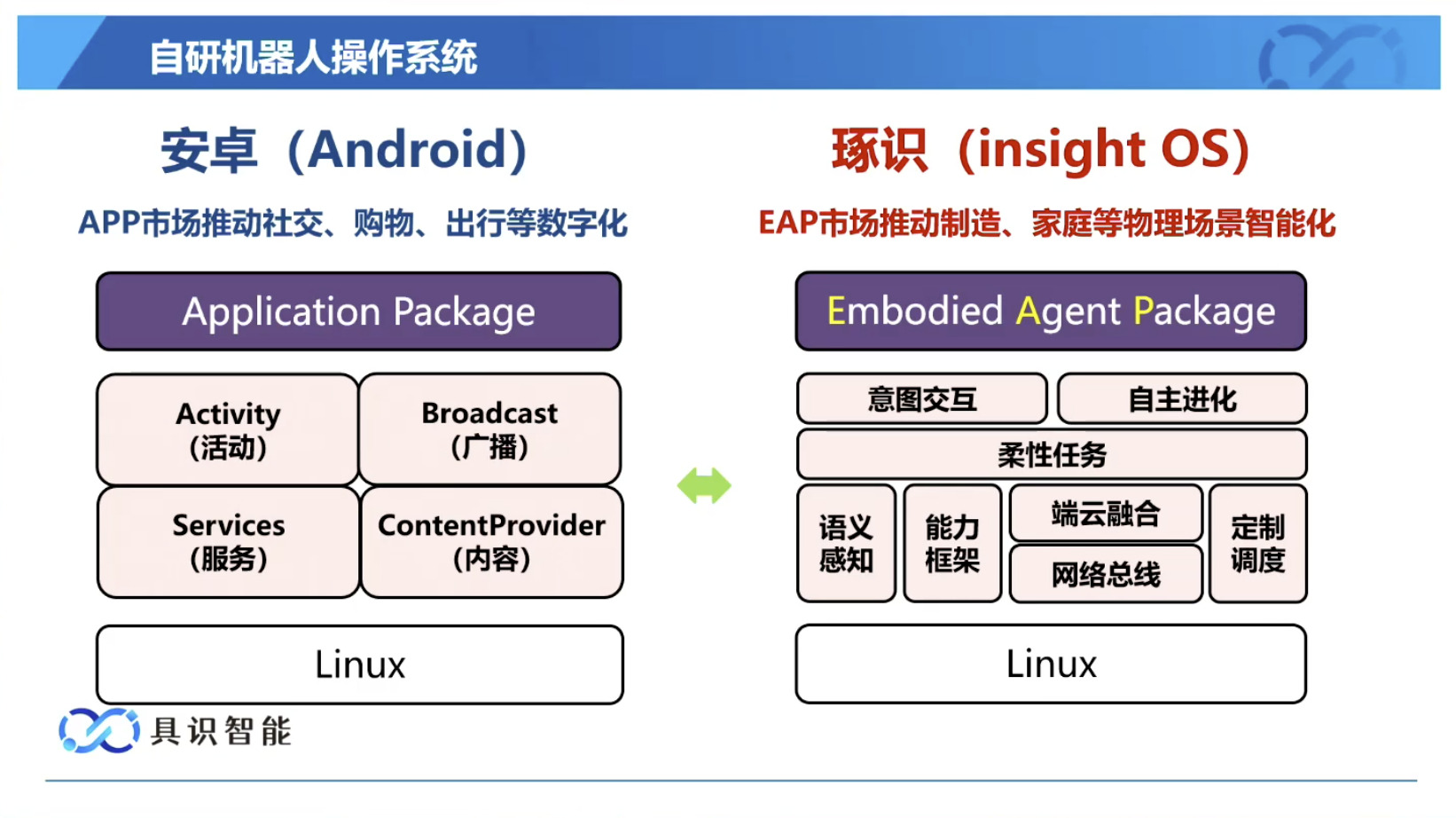 幻灯片概述了具识智能(Insight Robotics)公司研发的机器人智能操作系统 InsightOS。内容涵盖了该操作系统的背景意义、产品形态、关键技术及其应用示范。幻灯片着重介绍了 InsightOS 作为具身智能代理(EAP)与集成开发环境(IDE)结合的架构,并将其与安卓系统进行了对比,强调了其在制造业和家庭场景智能化的优势。此外,还展示了 InsightOS 在提高开发效率、处理运行异常和优化现场调度方面的实际效果,并提供了已适配的多种机器人型号清单。