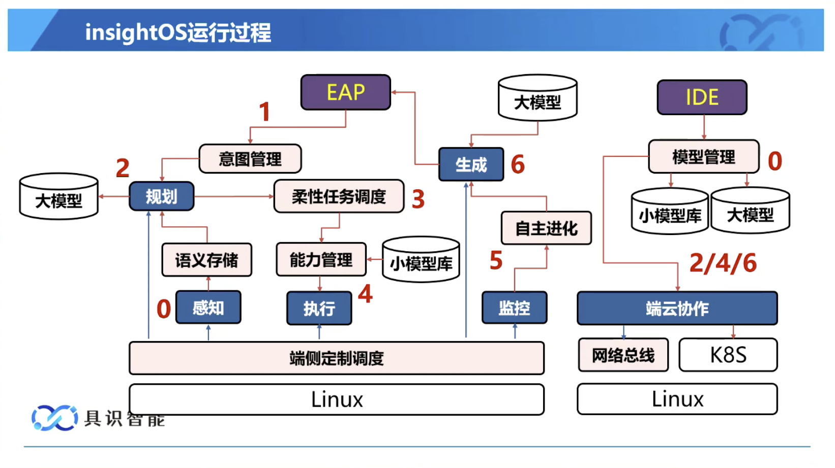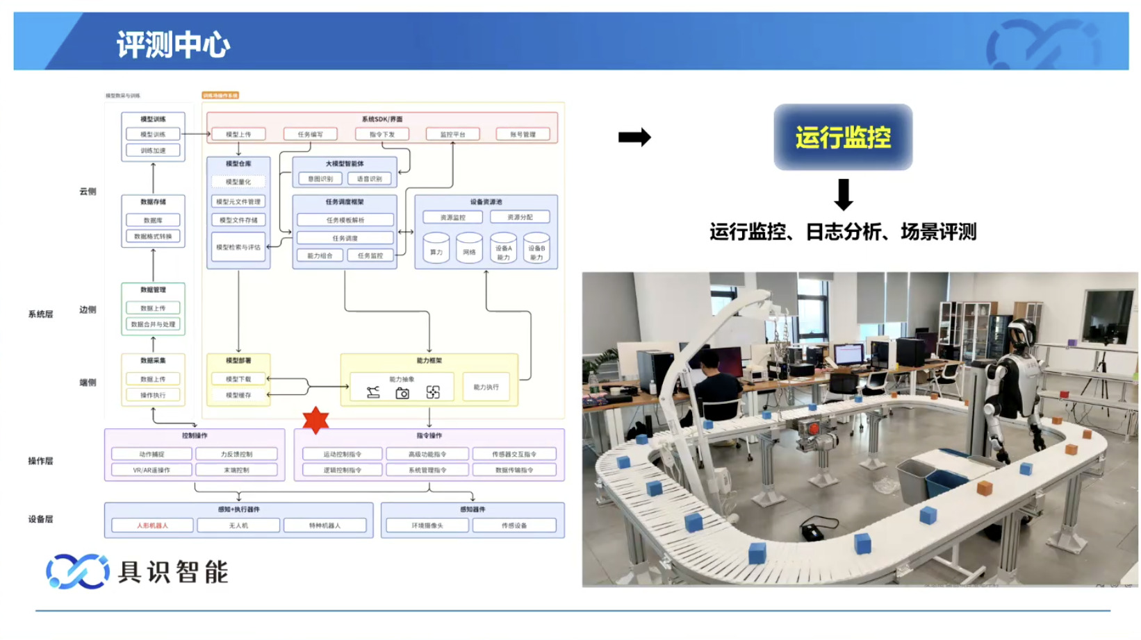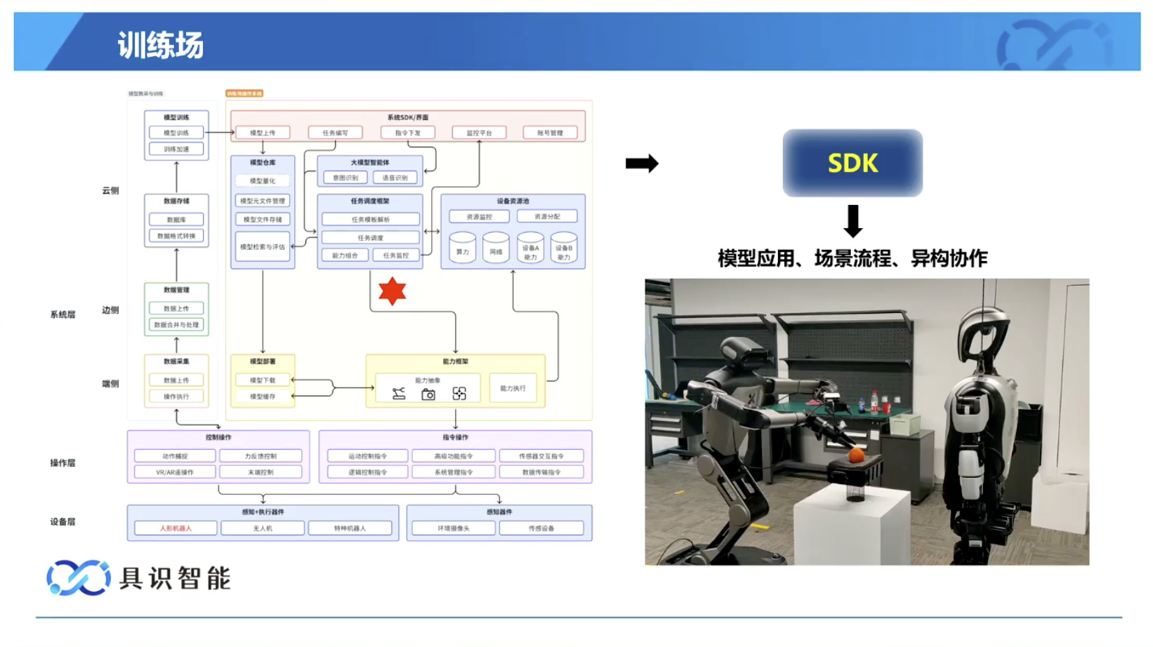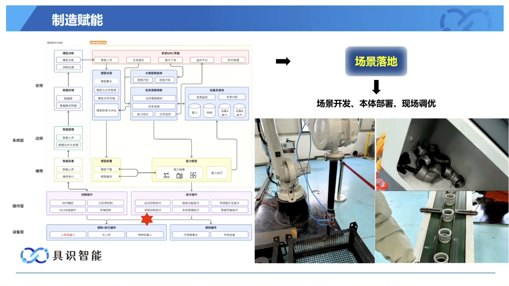 幻灯片概述了具识智能(Insight Robotics)公司研发的机器人智能操作系统 InsightOS。内容涵盖了该操作系统的背景意义、产品形态、关键技术及其应用示范。幻灯片着重介绍了 InsightOS 作为具身智能代理(EAP)与集成开发环境(IDE)结合的架构,并将其与安卓系统进行了对比,强调了其在制造业和家庭场景智能化的优势。此外,还展示了 InsightOS 在提高开发效率、处理运行异常和优化现场调度方面的实际效果,并提供了已适配的多种机器人型号清单。