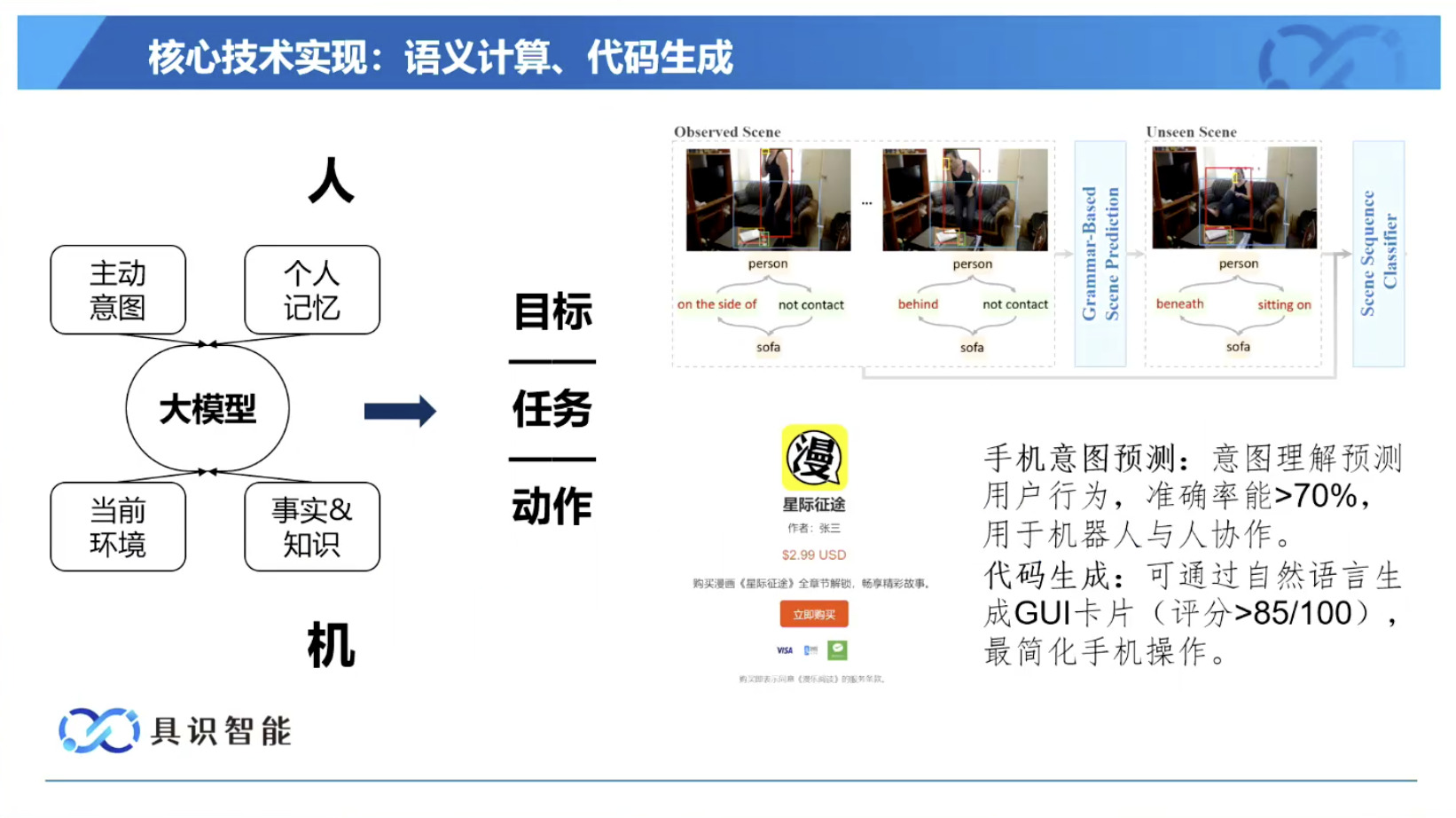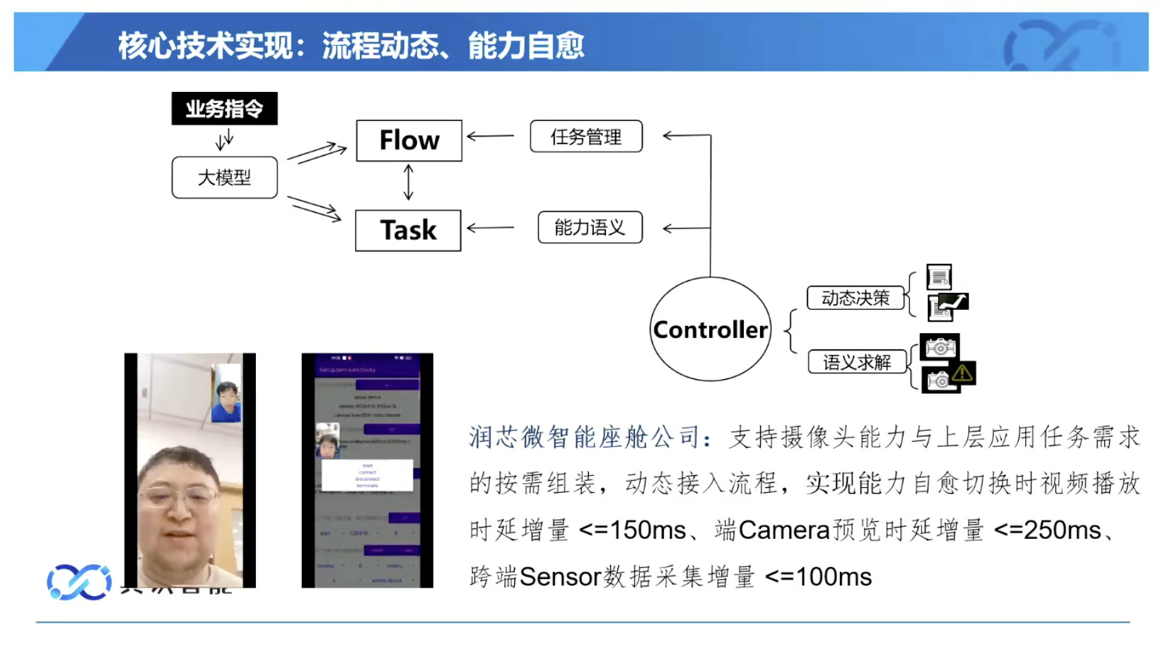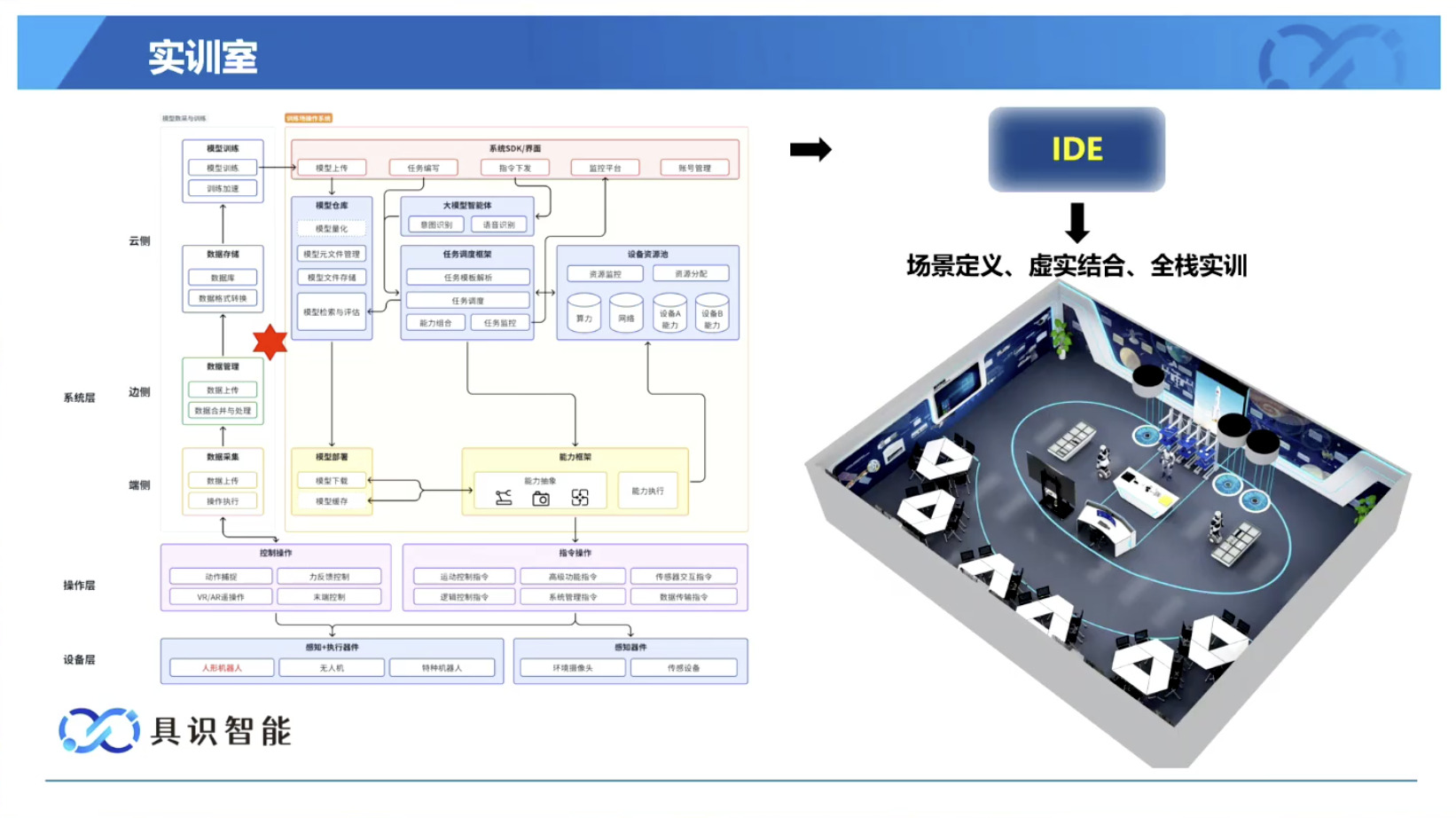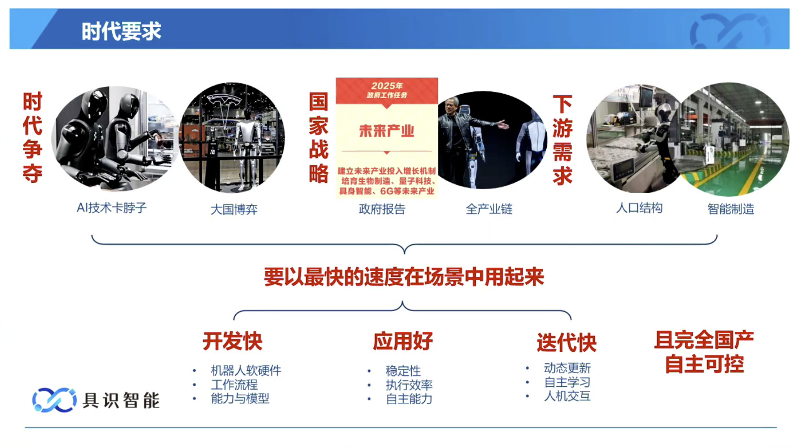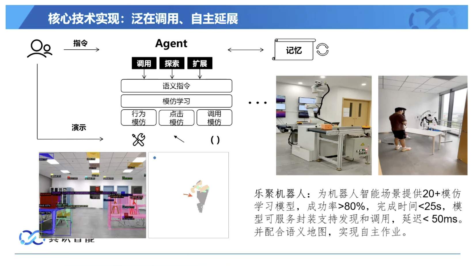 幻灯片概述了具识智能(Insight Robotics)公司研发的机器人智能操作系统 InsightOS。内容涵盖了该操作系统的背景意义、产品形态、关键技术及其应用示范。幻灯片着重介绍了 InsightOS 作为具身智能代理(EAP)与集成开发环境(IDE)结合的架构,并将其与安卓系统进行了对比,强调了其在制造业和家庭场景智能化的优势。此外,还展示了 InsightOS 在提高开发效率、处理运行异常和优化现场调度方面的实际效果,并提供了已适配的多种机器人型号清单。