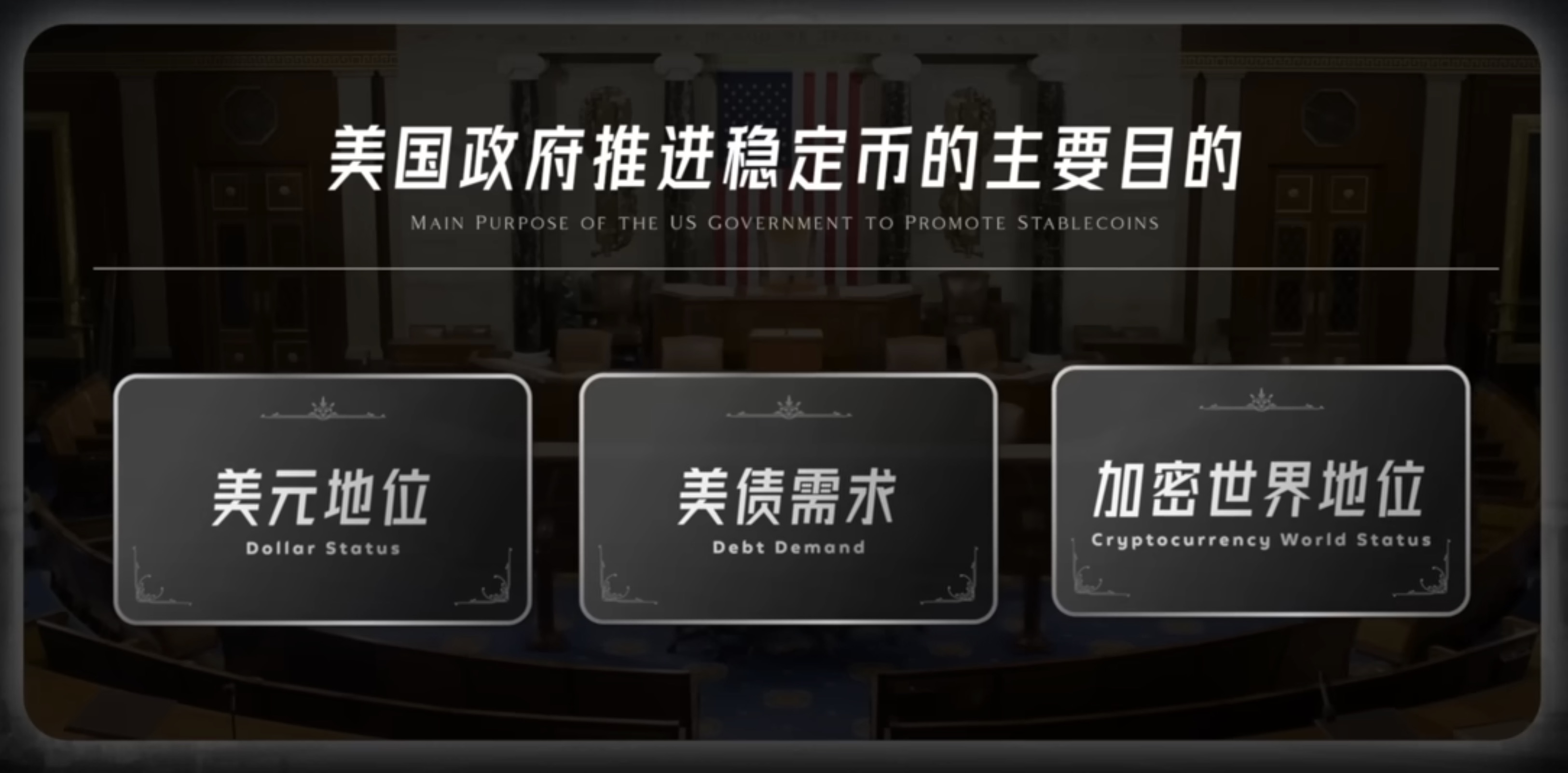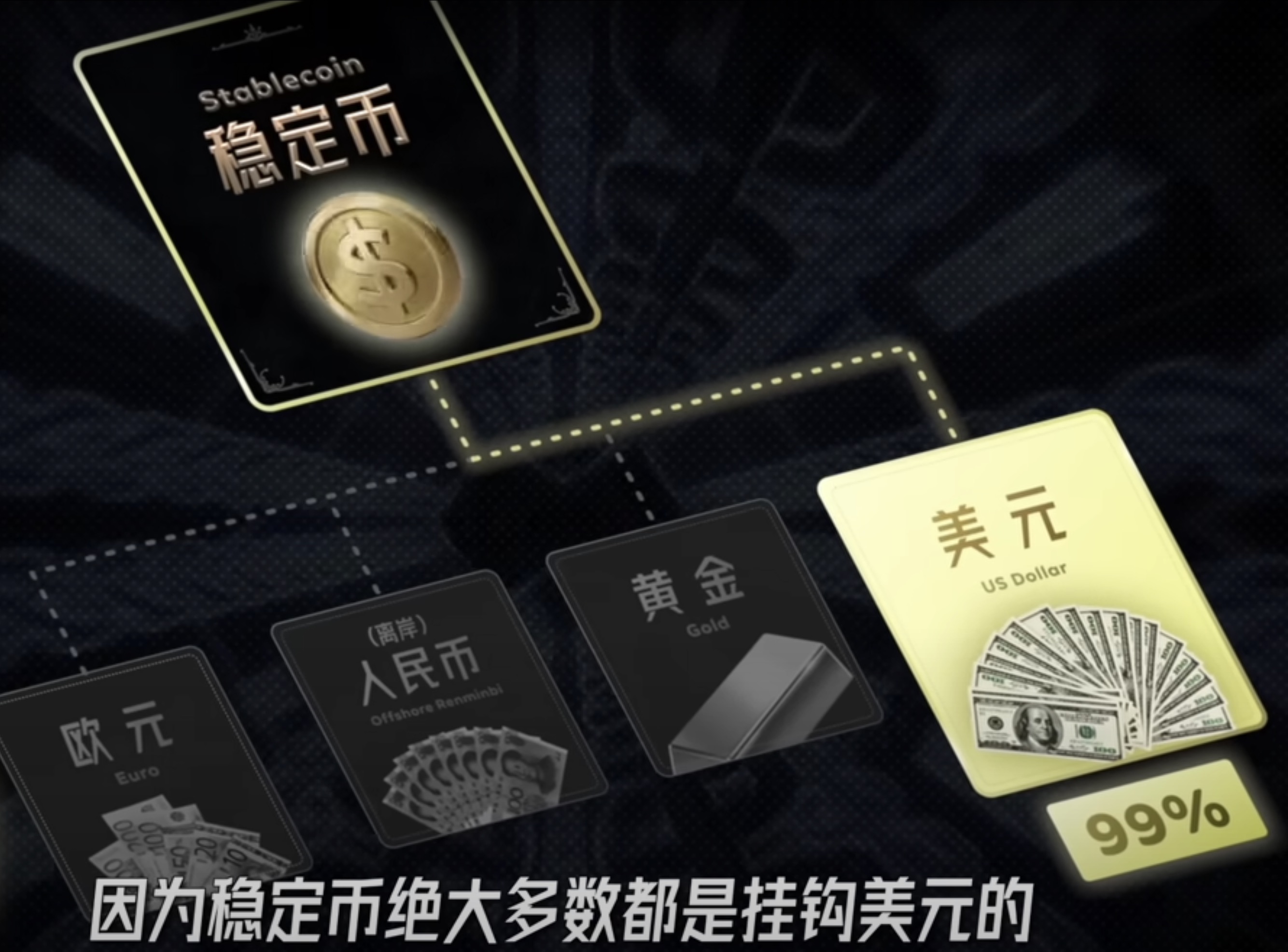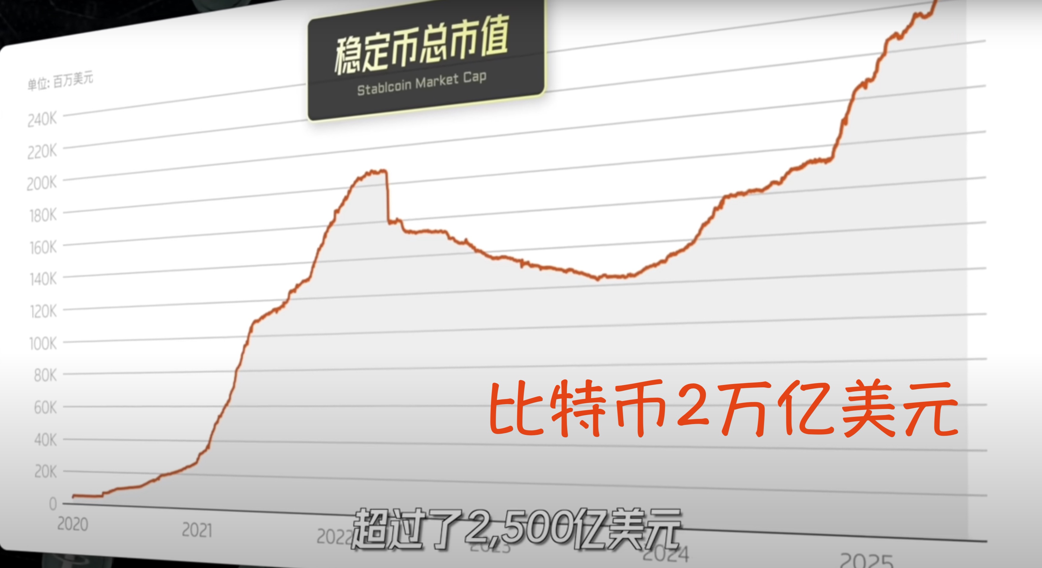 这些图表提供了关于稳定币市场的全面概览,展示了稳定币市值的显著增长,尤其是在2020年至2025年期间。资料强调,美元在稳定币中占据主导地位,99%的稳定币与美元挂钩,但同时也提到了与欧元、离岸人民币和黄金挂钩的稳定币。此外,它探讨了美国政府推广稳定币的主要原因,包括维持美元地位、满足美债需求和提升加密货币世界地位,并列出了获得合规核心牌照的主要司法管辖区,如美国、巴哈马、迪拜、澳大利亚、欧盟和新加坡。图表还展示了稳定币发行公司如何通过投资短期和长期国债来运作,并概述了香港稳定币沙盒计划的参与者,包括京东链、圆币创新以及渣打银行等,并最终讨论了稳定币对银行的潜在影响,包括利润损失和经济联系的降低。