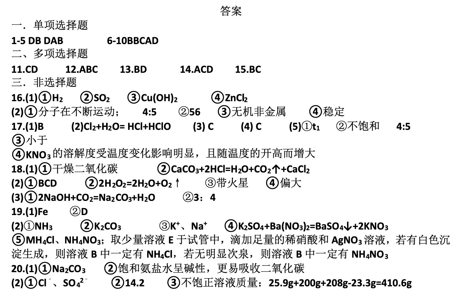 17.(1)B (2)Cl2+H2O=HCl+HCIO (3)C (4)C (5)①t1 ②不饱和 4:5