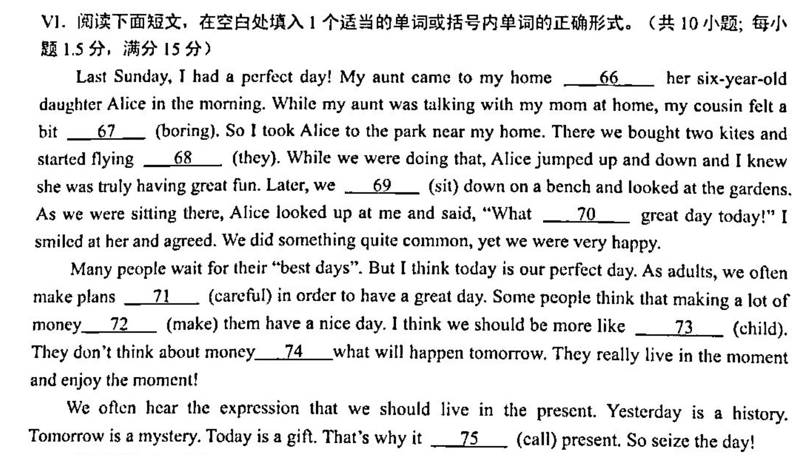 VI.阅读下面短文,在空白处填入1个适当的单词或括号内单词的正确形式。(共 10小题;每小题1.5分,满分15分)