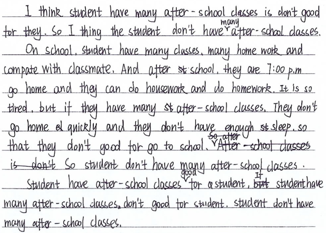 I think student have many after-school classes is don’t good for they. So I thing the student don’t have after-school classes. many On school, Student have many classes, many homework and compate with classmate, And after school, they are 7:00 p.m go home and they can do housework and do homework. It is so tired, but if they have many \(after-school classes, They don't go home el quickly and they don't have enough\) sleep, so that they don’t good for go to school. $$ After-school classes is don’t So student don’t have many after-school classes. good Student have after-school classes for a student, but student have many after-school classes, don’t good for student. Student don’t have many after-school classes.