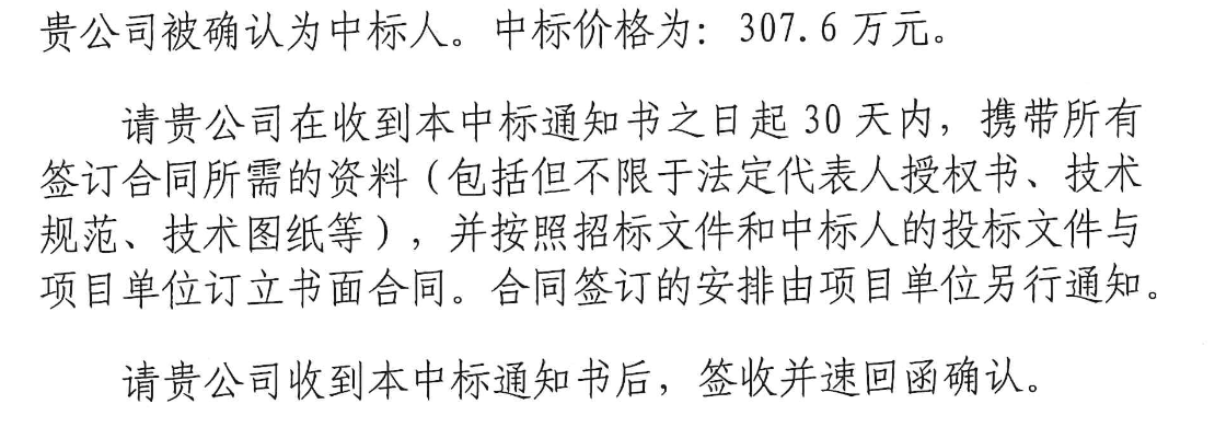 贵公司被认为中标人。中标价格为:307.6万元。 请贵公司在收到本中标通知书之日起30天内,携带所有签订合同所需的资料(包括但不限于法定代表人授权书、技术规范、技术图纸等),并按照招标文件和中标人的投标文件与项目单位订立书面合同。合同签订的安排由项目单位另行通知。 请贵公司收到本中标通知书后,签收并速回函确认。