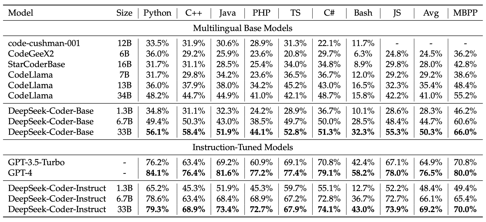 | DeepSeek-Coder-Base | 33B | 56.1% | 58.4% | 51.9% | 44.1% | 52.8% | 51.3% | 32.3% | 55.3% | 50.3% | 66.0% |