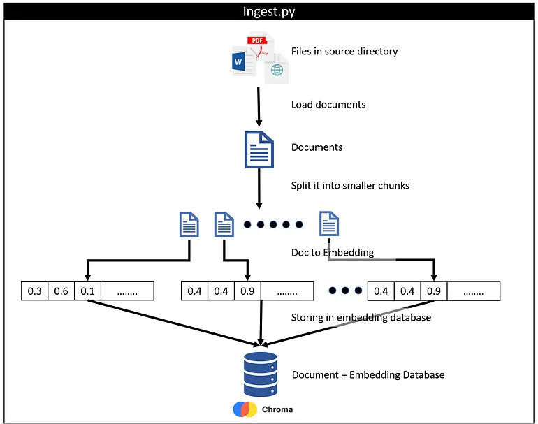 这张图片展示了一个Python脚本(Ingest.py)的工作流程,它将source目录中的文件加载并处理,将其分割成小块,并为每个小块生成嵌入向量(embedding),最后将文件及其嵌入向量存储在数据库中。