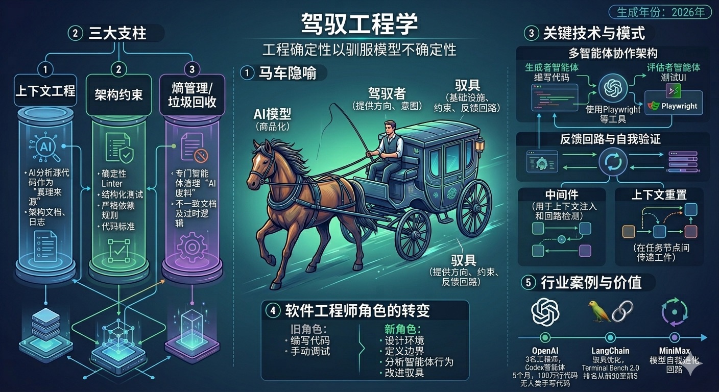 - Harness(马具/支架):指代基础设施。包括约束机制、护栏和反馈回路,用于将模型的原始能力转化为生产力。