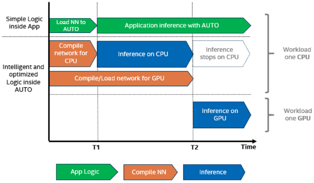 - Auto-Device selection 通过自我发现系统中所有可用的加速器和功能,推导出该设备上的最佳优化设置,选择最好的设备。