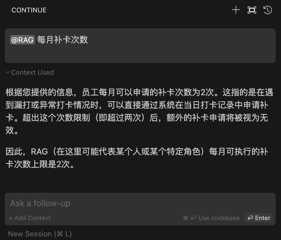 目前,代码库检索功能作为“代码库”和“文件夹”上下文提供者可用。您可以通过在输入框中键入 @codebase 或 @folder 并随后提出问题来使用它们。输入框中的内容将与代码库(或文件夹)中其余部分的嵌入式数据进行比较,以确定相关的文件。