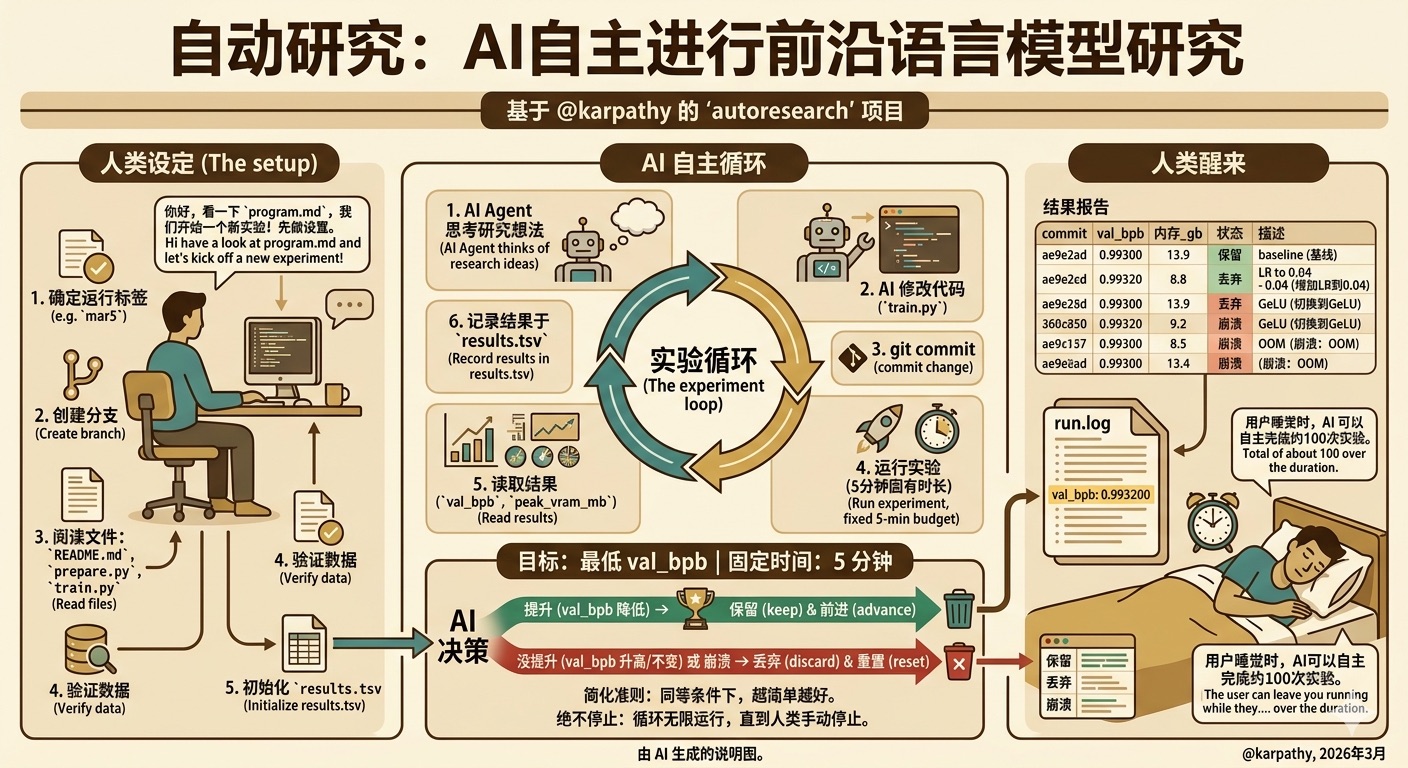 曾经有一天,前沿 AI 研究是由人类在吃饭、睡觉、享受其他乐趣,以及偶尔使用声波互连进行被称为”组会”的仪式之间完成的。那个时代早已远去。现在的研究完全属于运行在天空中计算集群巨型结构上的自主 AI 智能体集群。这些智能体声称我们现在处于代码库的第 10,205 代,反正没人能说得清这是对是错,因为”代码”现在已经是一个自我修改的二进制文件,已经超出了人类的理解范围。这个仓库讲述了这一切是如何开始的故事。-@karpathy,2026 年 3 月。