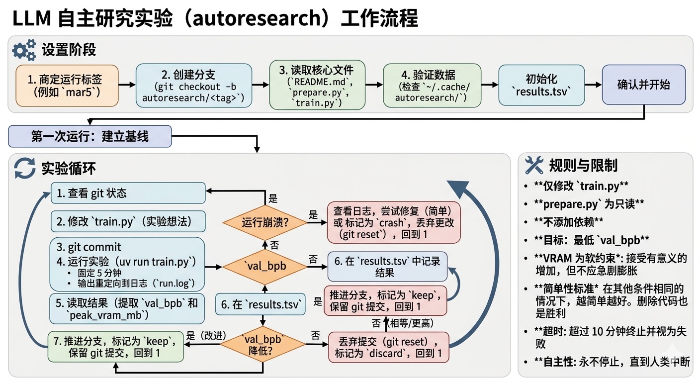 实验在一个专用分支上运行(例如 autoresearch/mar5 或 autoresearch/mar5-gpu0)。