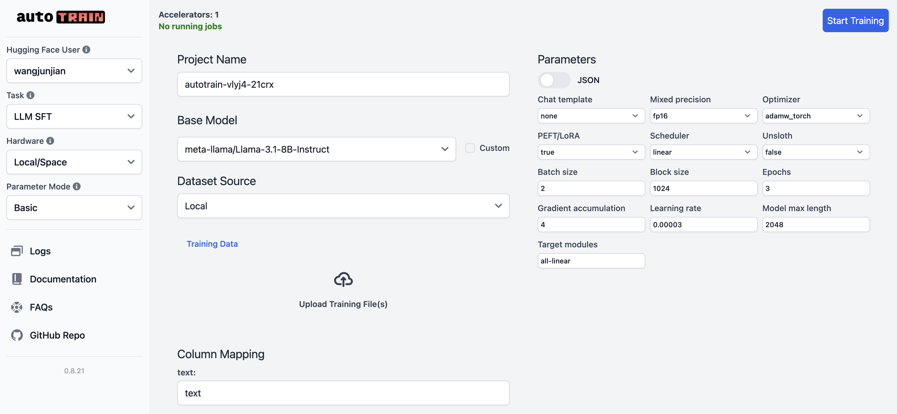 浏览器打开 http://127.0.0.1:8080/ui/ 以查看 AutoTrain 的界面。