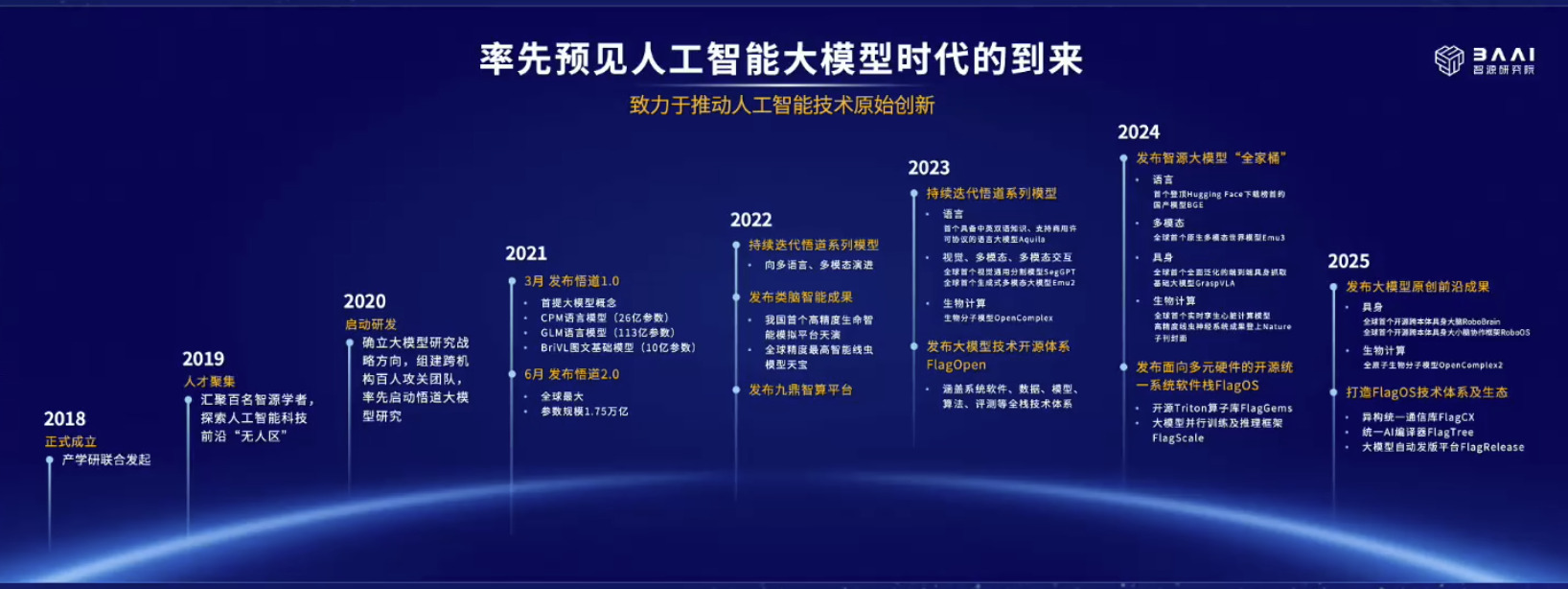 本文档概述了北京智源人工智能研究院 (BAAI),一个致力于推动人工智能原始创新的新型研发机构。它详细介绍了 BAAI 的发展历程,从2018年成立至今,以及其在大型人工智能模型领域取得的重大进展,包括推出 FlagOpen 开放平台。此外,来源还介绍了 BAAI 在具身智能和生命科学等前沿领域的具体研究成果,例如 RoboOS 2.0 和 OpenComplex2。整体而言,这份资料展现了 BAAI 在构建通用人工智能、推动开放生态以及解决现实世界问题方面的努力和愿景。