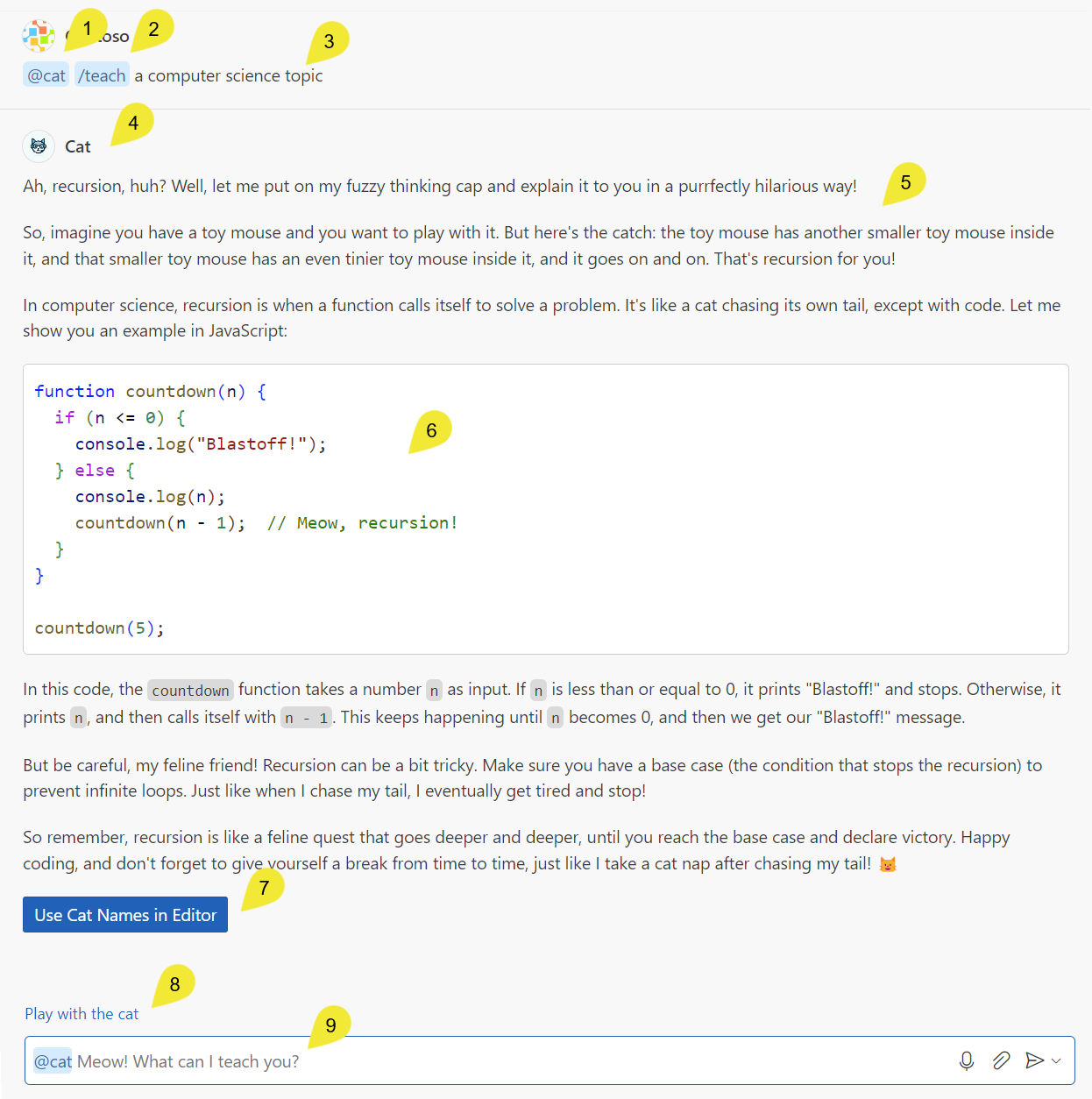 作为开发聊天扩展的起点,您可以参考我们的 chat extension sample。此示例实现了一个简单的猫导师,可以使用猫隐喻解释计算机科学主题。