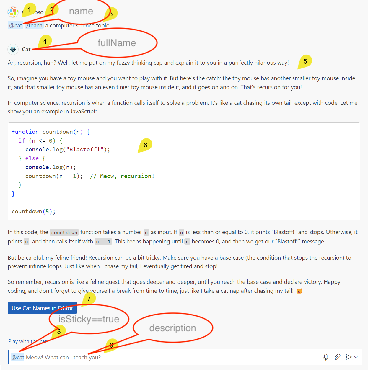 通过使用您提供的 @ 符号和 name,用户可以在 Chat 视图中引用聊天参与者。fullName 显示在参与者响应的标题区域中。description 用作聊天输入字段中的占位文本。
