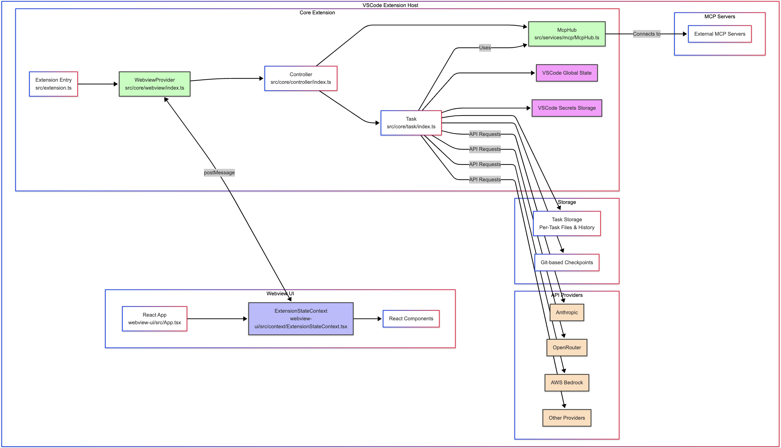 上面展示 Cline 扩展高级架构的 Mermaid 图表。该图表说明了: