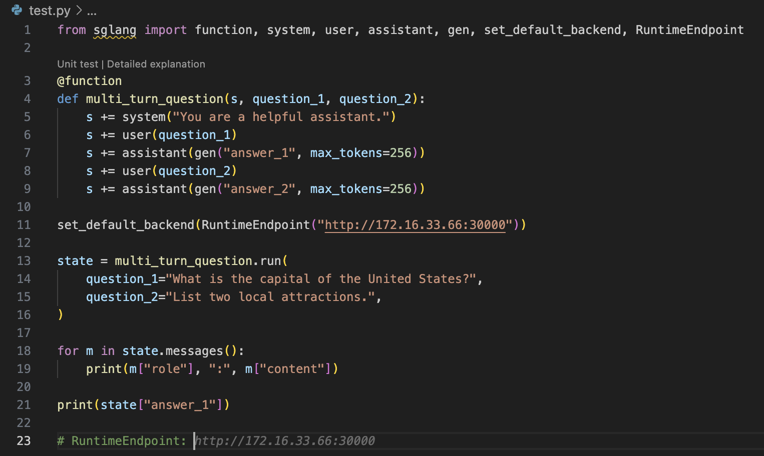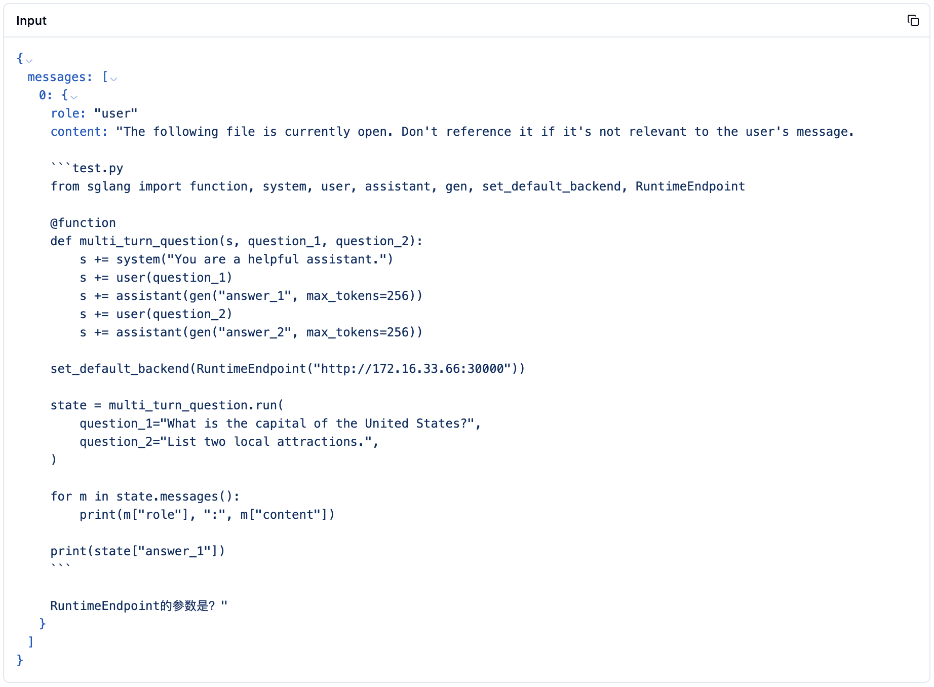 "content": "The following file is currently open. Don't reference it if it's not relevant to the user's message.\n\n```test.py\nfrom sglang import function, system, user, assistant, gen, set_default_backend, RuntimeEndpoint\n\n@function\ndef multi_turn_question(s, question_1, question_2):\n s += system(\"You are a helpful assistant.\")\n s += user(question_1)\n s += assistant(gen(\"answer_1\", max_tokens=256))\n s += user(question_2)\n s += assistant(gen(\"answer_2\", max_tokens=256))\n\nset_default_backend(RuntimeEndpoint(\"http://172.16.33.66:30000\"))\n\nstate = multi_turn_question.run(\n question_1=\"What is the capital of the United States?\",\n question_2=\"List two local attractions.\",\n)\n\nfor m in state.messages():\n print(m[\"role\"], \":\", m[\"content\"])\n\nprint(state[\"answer_1\"])\n```\n\nRuntimeEndpoint的参数是?"