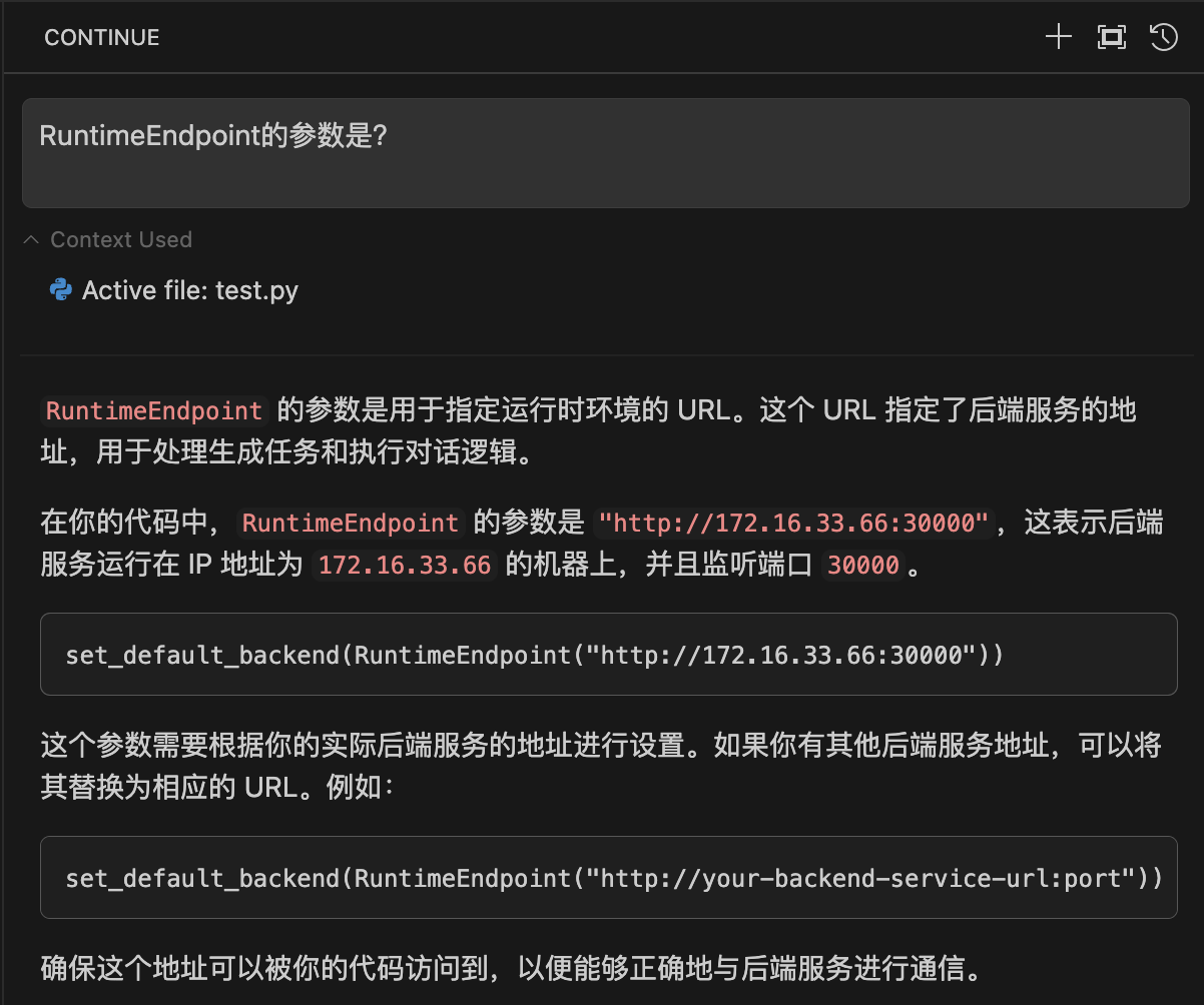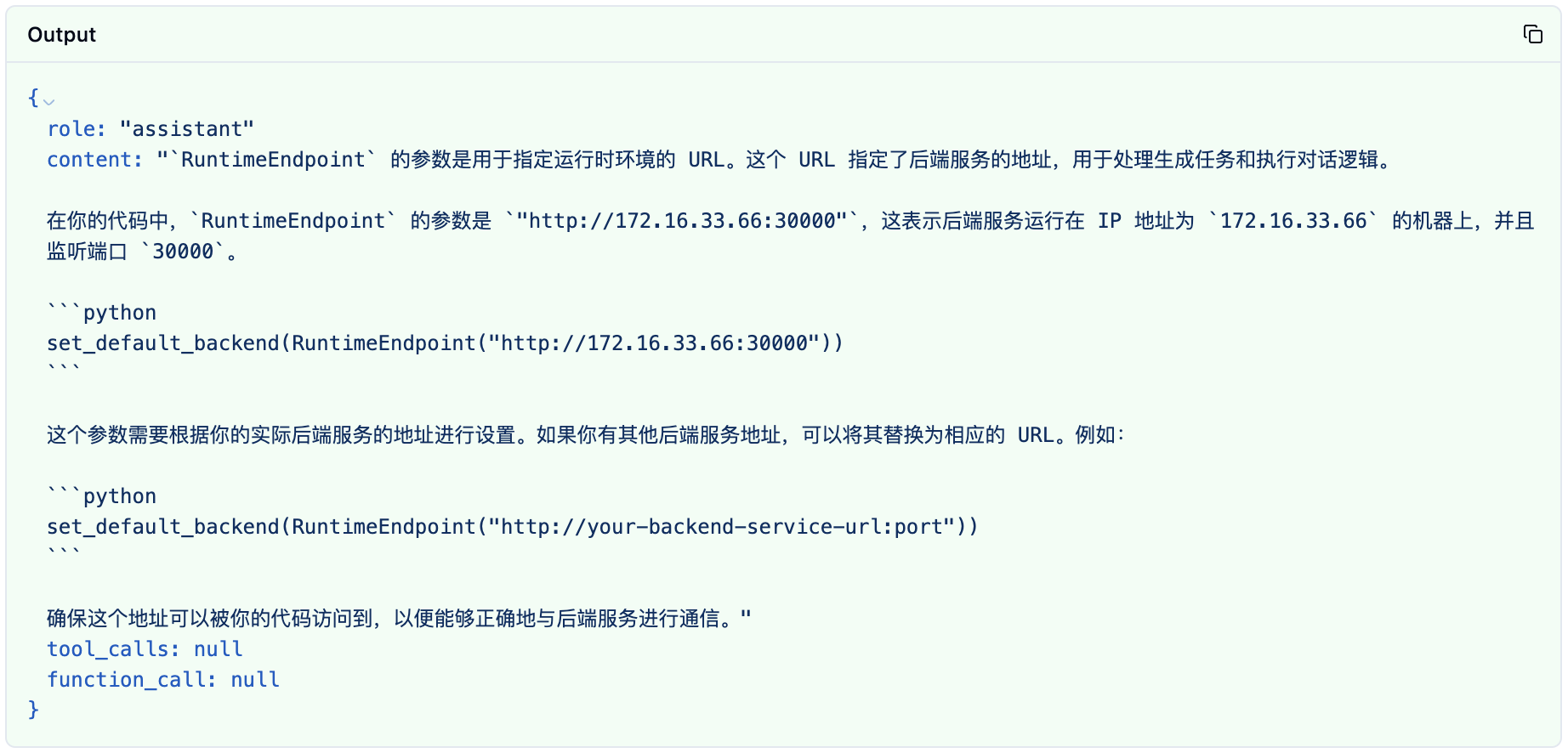 "content": "`RuntimeEndpoint` 的参数是用于指定运行时环境的 URL。这个 URL 指定了后端服务的地址,用于处理生成任务和执行对话逻辑。\n\n在你的代码中,`RuntimeEndpoint` 的参数是 `\"http://172.16.33.66:30000\"`,这表示后端服务运行在 IP 地址为 `172.16.33.66` 的机器上,并且监听端口 `30000`。\n\n```python\nset_default_backend(RuntimeEndpoint(\"http://172.16.33.66:30000\"))\n```\n\n这个参数需要根据你的实际后端服务的地址进行设置。如果你有其他后端服务地址,可以将其替换为相应的 URL。例如:\n\n```python\nset_default_backend(RuntimeEndpoint(\"http://your-backend-service-url:port\"))\n```\n\n确保这个地址可以被你的代码访问到,以便能够正确地与后端服务进行通信。",