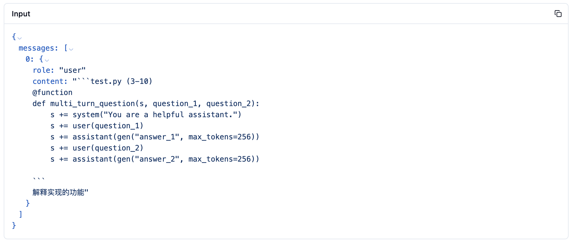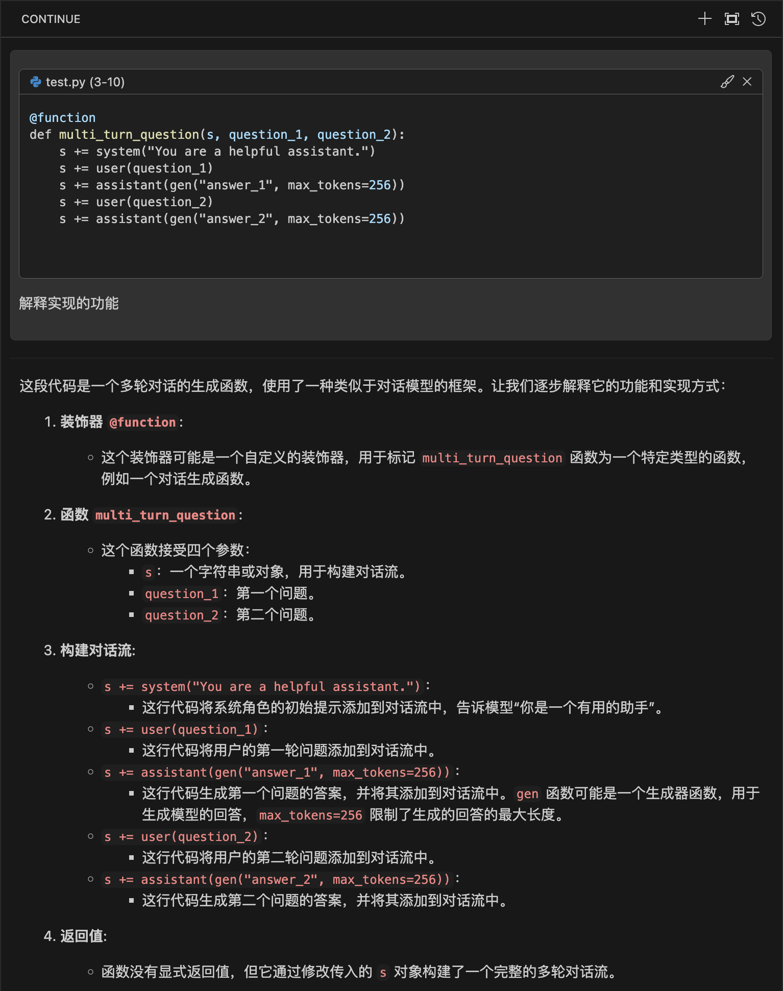 "content": "```test.py (3-10)\n@function\ndef multi_turn_question(s, question_1, question_2):\n s += system(\"You are a helpful assistant.\")\n s += user(question_1)\n s += assistant(gen(\"answer_1\", max_tokens=256))\n s += user(question_2)\n s += assistant(gen(\"answer_2\", max_tokens=256))\n\n```\n解释实现的功能"