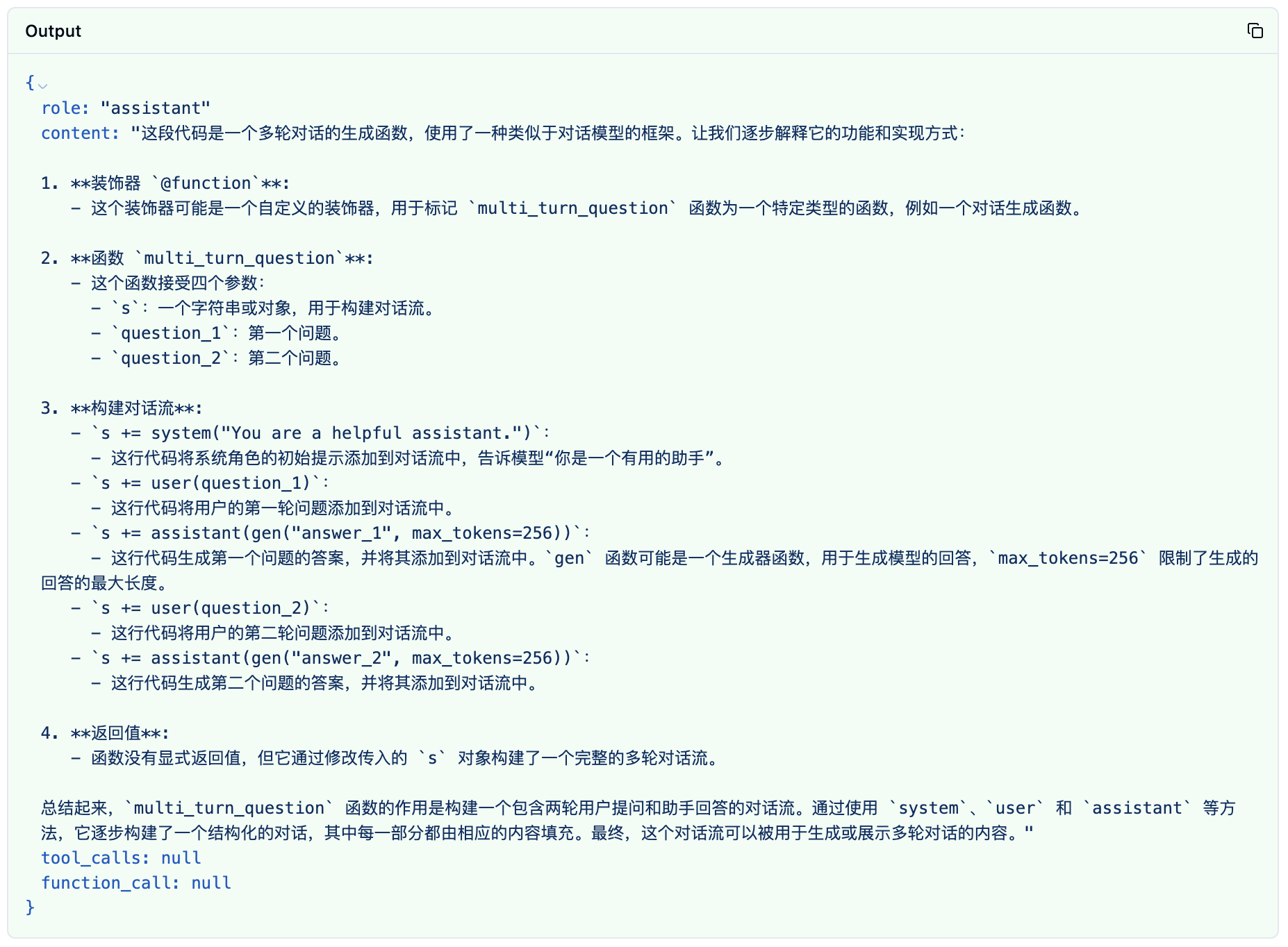 "content": "这段代码是一个多轮对话的生成函数,使用了一种类似于对话模型的框架。让我们逐步解释它的功能和实现方式:\n\n1. **装饰器 `@function`**:\n - 这个装饰器可能是一个自定义的装饰器,用于标记 `multi_turn_question` 函数为一个特定类型的函数,例如一个对话生成函数。\n\n2. **函数 `multi_turn_question`**:\n - 这个函数接受四个参数:\n - `s`:一个字符串或对象,用于构建对话流。\n - `question_1`:第一个问题。\n - `question_2`:第二个问题。\n\n3. **构建对话流**:\n - `s += system(\"You are a helpful assistant.\")`:\n - 这行代码将系统角色的初始提示添加到对话流中,告诉模型“你是一个有用的助手”。\n - `s += user(question_1)`:\n - 这行代码将用户的第一轮问题添加到对话流中。\n - `s += assistant(gen(\"answer_1\", max_tokens=256))`:\n - 这行代码生成第一个问题的答案,并将其添加到对话流中。`gen` 函数可能是一个生成器函数,用于生成模型的回答,`max_tokens=256` 限制了生成的回答的最大长度。\n - `s += user(question_2)`:\n - 这行代码将用户的第二轮问题添加到对话流中。\n - `s += assistant(gen(\"answer_2\", max_tokens=256))`:\n - 这行代码生成第二个问题的答案,并将其添加到对话流中。\n\n4. **返回值**:\n - 函数没有显式返回值,但它通过修改传入的 `s` 对象构建了一个完整的多轮对话流。\n\n总结起来,`multi_turn_question` 函数的作用是构建一个包含两轮用户提问和助手回答的对话流。通过使用 `system`、`user` 和 `assistant` 等方法,它逐步构建了一个结构化的对话,其中每一部分都由相应的内容填充。最终,这个对话流可以被用于生成或展示多轮对话的内容。",