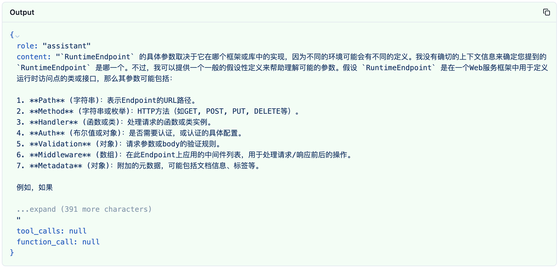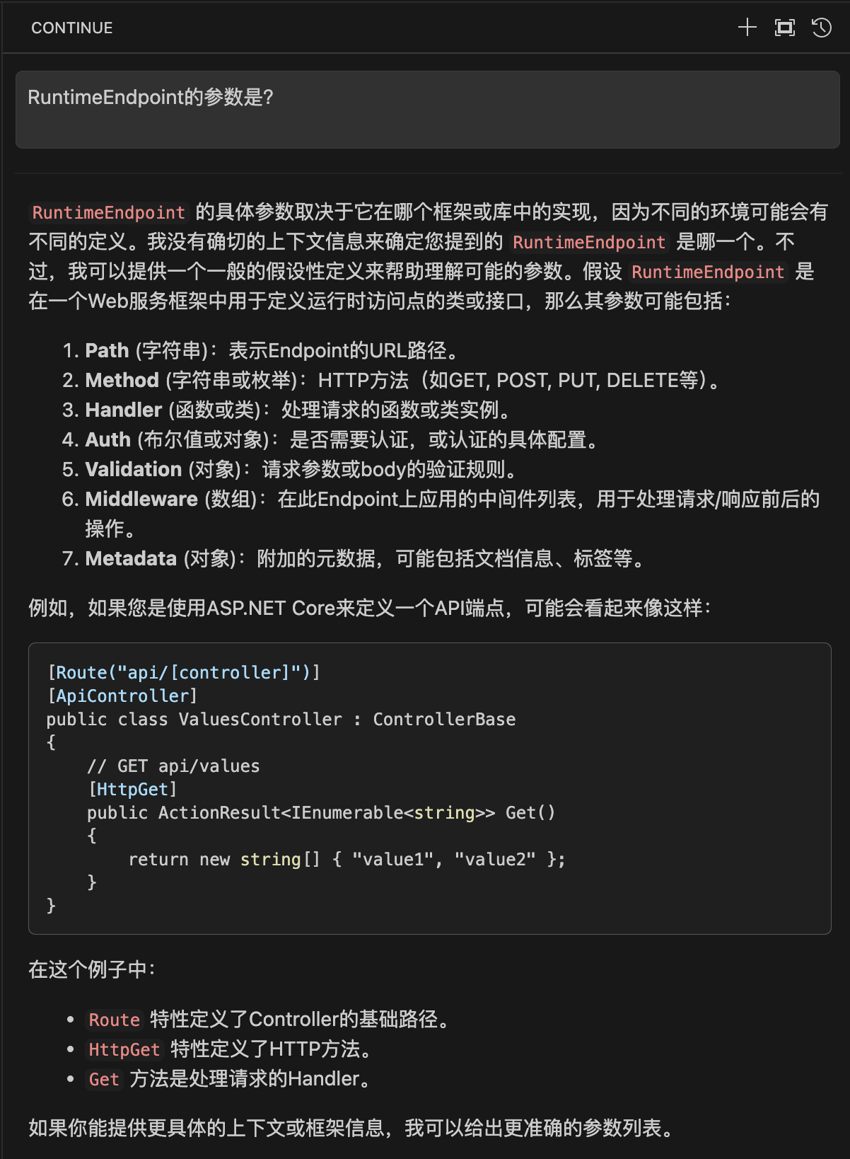 "content": "`RuntimeEndpoint` 的具体参数取决于它在哪个框架或库中的实现,因为不同的环境可能会有不同的定义。我没有确切的上下文信息来确定您提到的 `RuntimeEndpoint` 是哪一个。不过,我可以提供一个一般的假设性定义来帮助理解可能的参数。假设 `RuntimeEndpoint` 是在一个Web服务框架中用于定义运行时访问点的类或接口,那么其参数可能包括:\n\n1. **Path** (字符串):表示Endpoint的URL路径。\n2. **Method** (字符串或枚举):HTTP方法(如GET, POST, PUT, DELETE等)。\n3. **Handler** (函数或类):处理请求的函数或类实例。\n4. **Auth** (布尔值或对象):是否需要认证,或认证的具体配置。\n5. **Validation** (对象):请求参数或body的验证规则。\n6. **Middleware** (数组):在此Endpoint上应用的中间件列表,用于处理请求/响应前后的操作。\n7. **Metadata** (对象):附加的元数据,可能包括文档信息、标签等。\n\n例如,如果您是使用ASP.NET Core来定义一个API端点,可能会看起来像这样:\n\n```csharp\n[Route(\"api/[controller]\")]\n[ApiController]\npublic class ValuesController : ControllerBase\n{\n // GET api/values\n [HttpGet]\n public ActionResult<IEnumerable<string>> Get()\n {\n return new string[] { \"value1\", \"value2\" };\n }\n}\n```\n\n在这个例子中:\n- `Route` 特性定义了Controller的基础路径。\n- `HttpGet` 特性定义了HTTP方法。\n- `Get` 方法是处理请求的Handler。\n\n如果你能提供更具体的上下文或框架信息,我可以给出更准确的参数列表。",