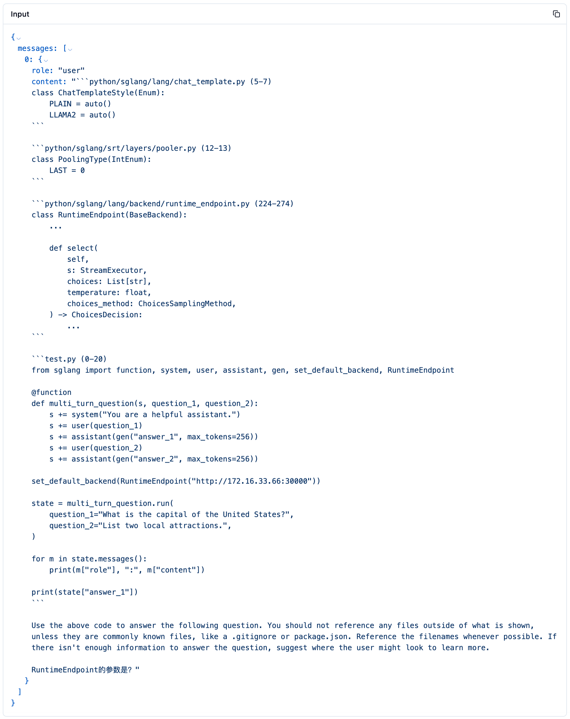 "content": "```python/sglang/lang/chat_template.py (5-7)\nclass ChatTemplateStyle(Enum):\n PLAIN = auto()\n LLAMA2 = auto()\n```\n\n```python/sglang/srt/layers/pooler.py (12-13)\nclass PoolingType(IntEnum):\n LAST = 0\n```\n\n```python/sglang/lang/backend/runtime_endpoint.py (224-274)\nclass RuntimeEndpoint(BaseBackend):\n ...\n\n def select(\n self,\n s: StreamExecutor,\n choices: List[str],\n temperature: float,\n choices_method: ChoicesSamplingMethod,\n ) -> ChoicesDecision:\n ...\n```\n\n```test.py (0-20)\nfrom sglang import function, system, user, assistant, gen, set_default_backend, RuntimeEndpoint\n\n@function\ndef multi_turn_question(s, question_1, question_2):\n s += system(\"You are a helpful assistant.\")\n s += user(question_1)\n s += assistant(gen(\"answer_1\", max_tokens=256))\n s += user(question_2)\n s += assistant(gen(\"answer_2\", max_tokens=256))\n\nset_default_backend(RuntimeEndpoint(\"http://172.16.33.66:30000\"))\n\nstate = multi_turn_question.run(\n question_1=\"What is the capital of the United States?\",\n question_2=\"List two local attractions.\",\n)\n\nfor m in state.messages():\n print(m[\"role\"], \":\", m[\"content\"])\n\nprint(state[\"answer_1\"])\n```\n\nUse the above code to answer the following question. You should not reference any files outside of what is shown, unless they are commonly known files, like a .gitignore or package.json. Reference the filenames whenever possible. If there isn't enough information to answer the question, suggest where the user might look to learn more.\n\nRuntimeEndpoint的参数是?"