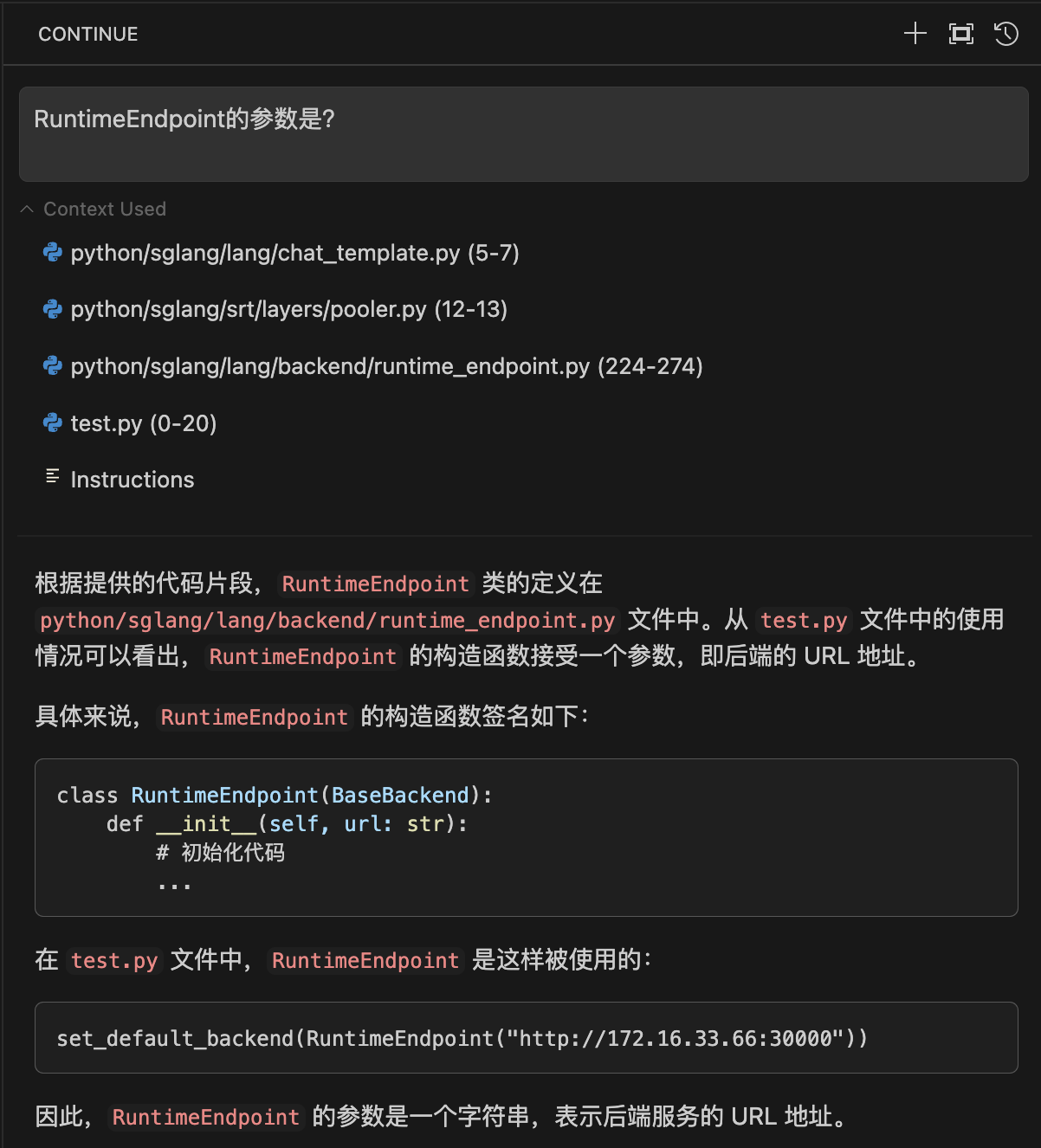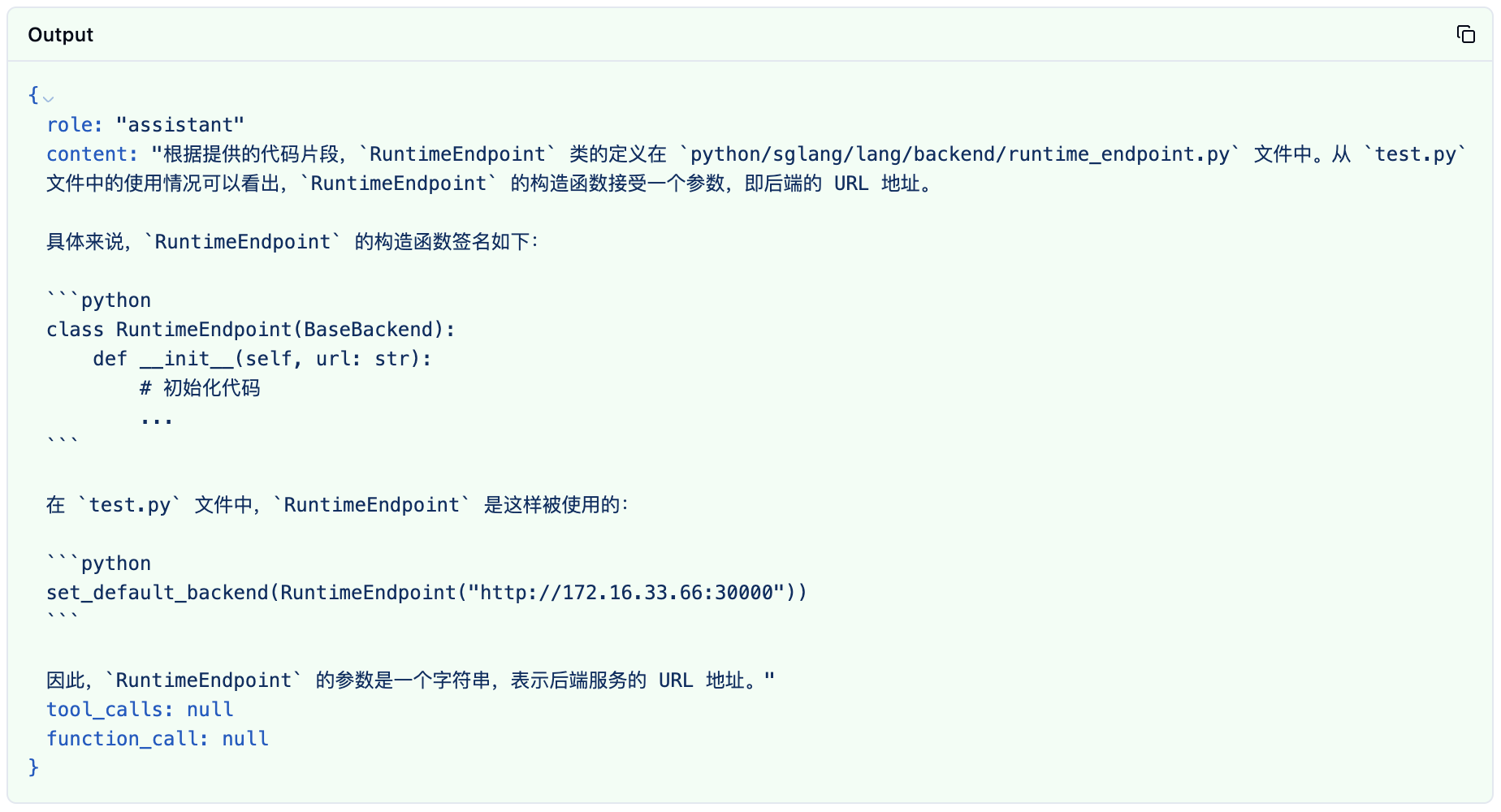 "content": "根据提供的代码片段,`RuntimeEndpoint` 类的定义在 `python/sglang/lang/backend/runtime_endpoint.py` 文件中。从 `test.py` 文件中的使用情况可以看出,`RuntimeEndpoint` 的构造函数接受一个参数,即后端的 URL 地址。\n\n具体来说,`RuntimeEndpoint` 的构造函数签名如下:\n\n```python\nclass RuntimeEndpoint(BaseBackend):\n def __init__(self, url: str):\n # 初始化代码\n ...\n```\n\n在 `test.py` 文件中,`RuntimeEndpoint` 是这样被使用的:\n\n```python\nset_default_backend(RuntimeEndpoint(\"http://172.16.33.66:30000\"))\n```\n\n因此,`RuntimeEndpoint` 的参数是一个字符串,表示后端服务的 URL 地址。",