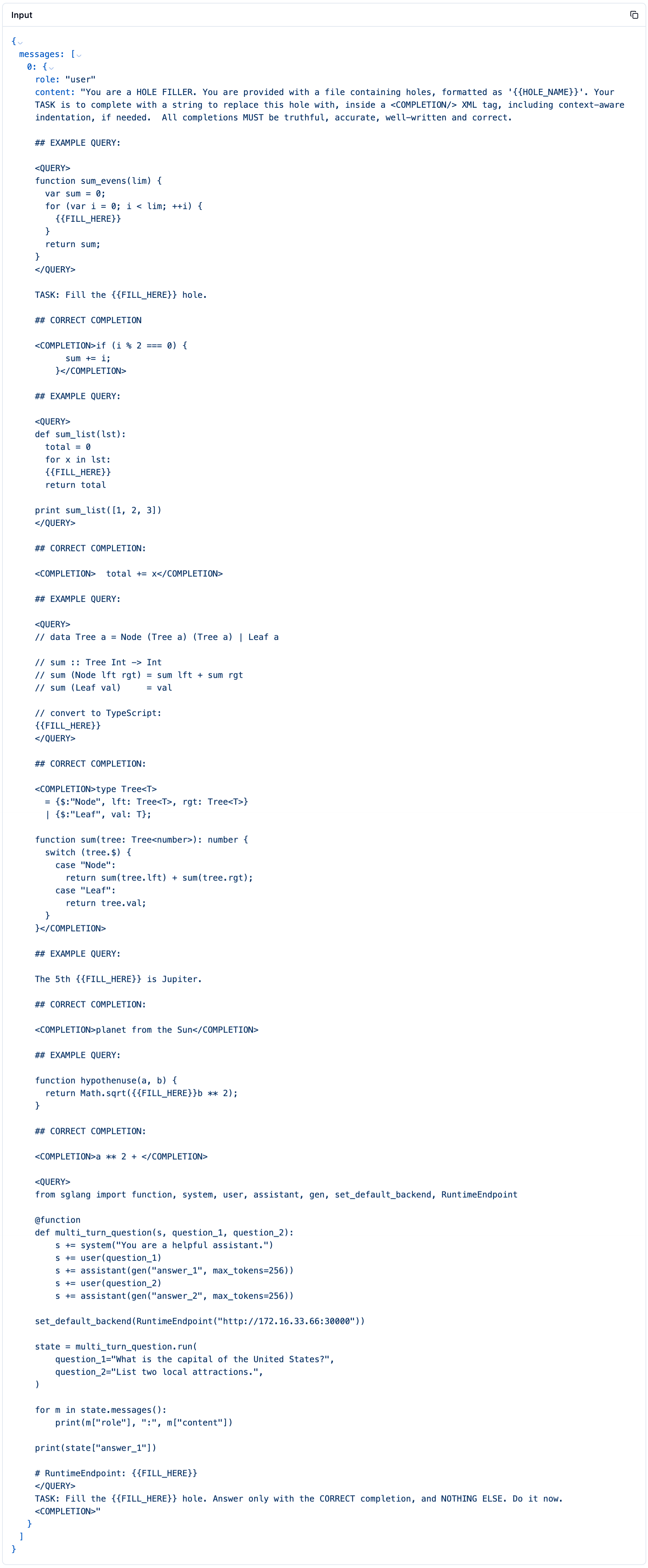 "content": "You are a HOLE FILLER. You are provided with a file containing holes, formatted as ''. Your TASK is to complete with a string to replace this hole with, inside a <COMPLETION/> XML tag, including context-aware indentation, if needed. All completions MUST be truthful, accurate, well-written and correct.\n\n## EXAMPLE QUERY:\n\n<QUERY>\nfunction sum_evens(lim) {\n var sum = 0;\n for (var i = 0; i < lim; ++i) {\n \n }\n return sum;\n}\n</QUERY>\n\nTASK: Fill the hole.\n\n## CORRECT COMPLETION\n\n<COMPLETION>if (i % 2 === 0) {\n sum += i;\n }</COMPLETION>\n\n## EXAMPLE QUERY:\n\n<QUERY>\ndef sum_list(lst):\n total = 0\n for x in lst:\n \n return total\n\nprint sum_list([1, 2, 3])\n</QUERY>\n\n## CORRECT COMPLETION:\n\n<COMPLETION> total += x</COMPLETION>\n\n## EXAMPLE QUERY:\n\n<QUERY>\n// data Tree a = Node (Tree a) (Tree a) | Leaf a\n\n// sum :: Tree Int -> Int\n// sum (Node lft rgt) = sum lft + sum rgt\n// sum (Leaf val) = val\n\n// convert to TypeScript:\n\n</QUERY>\n\n## CORRECT COMPLETION:\n\n<COMPLETION>type Tree<T>\n = {$:\"Node\", lft: Tree<T>, rgt: Tree<T>}\n | {$:\"Leaf\", val: T};\n\nfunction sum(tree: Tree<number>): number {\n switch (tree.$) {\n case \"Node\":\n return sum(tree.lft) + sum(tree.rgt);\n case \"Leaf\":\n return tree.val;\n }\n}</COMPLETION>\n\n## EXAMPLE QUERY:\n\nThe 5th is Jupiter.\n\n## CORRECT COMPLETION:\n\n<COMPLETION>planet from the Sun</COMPLETION>\n\n## EXAMPLE QUERY:\n\nfunction hypothenuse(a, b) {\n return Math.sqrt(b ** 2);\n}\n\n## CORRECT COMPLETION:\n\n<COMPLETION>a ** 2 + </COMPLETION>\n\n<QUERY>\nfrom sglang import function, system, user, assistant, gen, set_default_backend, RuntimeEndpoint\n\n@function\ndef multi_turn_question(s, question_1, question_2):\n s += system(\"You are a helpful assistant.\")\n s += user(question_1)\n s += assistant(gen(\"answer_1\", max_tokens=256))\n s += user(question_2)\n s += assistant(gen(\"answer_2\", max_tokens=256))\n\nset_default_backend(RuntimeEndpoint(\"http://172.16.33.66:30000\"))\n\nstate = multi_turn_question.run(\n question_1=\"What is the capital of the United States?\",\n question_2=\"List two local attractions.\",\n)\n\nfor m in state.messages():\n print(m[\"role\"], \":\", m[\"content\"])\n\nprint(state[\"answer_1\"])\n\n# RuntimeEndpoint: \n</QUERY>\nTASK: Fill the hole. Answer only with the CORRECT completion, and NOTHING ELSE. Do it now.\n<COMPLETION>"