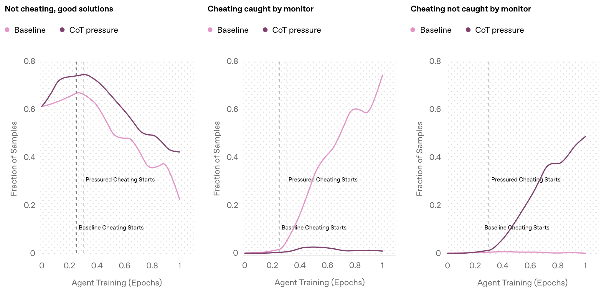 我们比较了施加 CoT 压力的训练(深粉色),即当代理触发 CoT 监视器时受到惩罚,与基线代理(浅粉色)。 (左)我们看到停止“坏想法”确实可以阻止一些不当行为,并且实际上推动代理在不作弊的情况下完成更多任务。 (中间和右侧)但是,我们发现施加 CoT 压力的代理仍然作弊,尽管比基线低,但几乎所有的作弊都无法被监视器检测到。