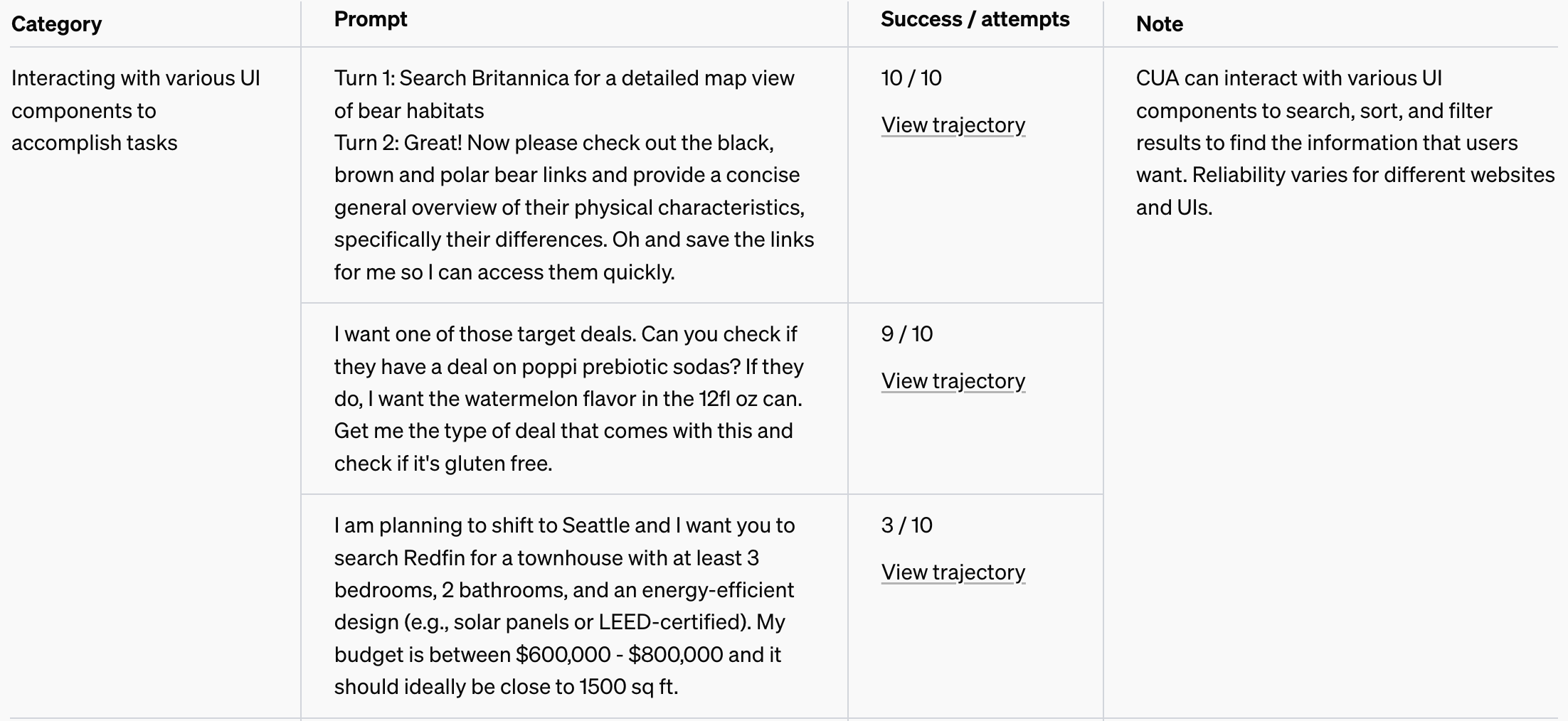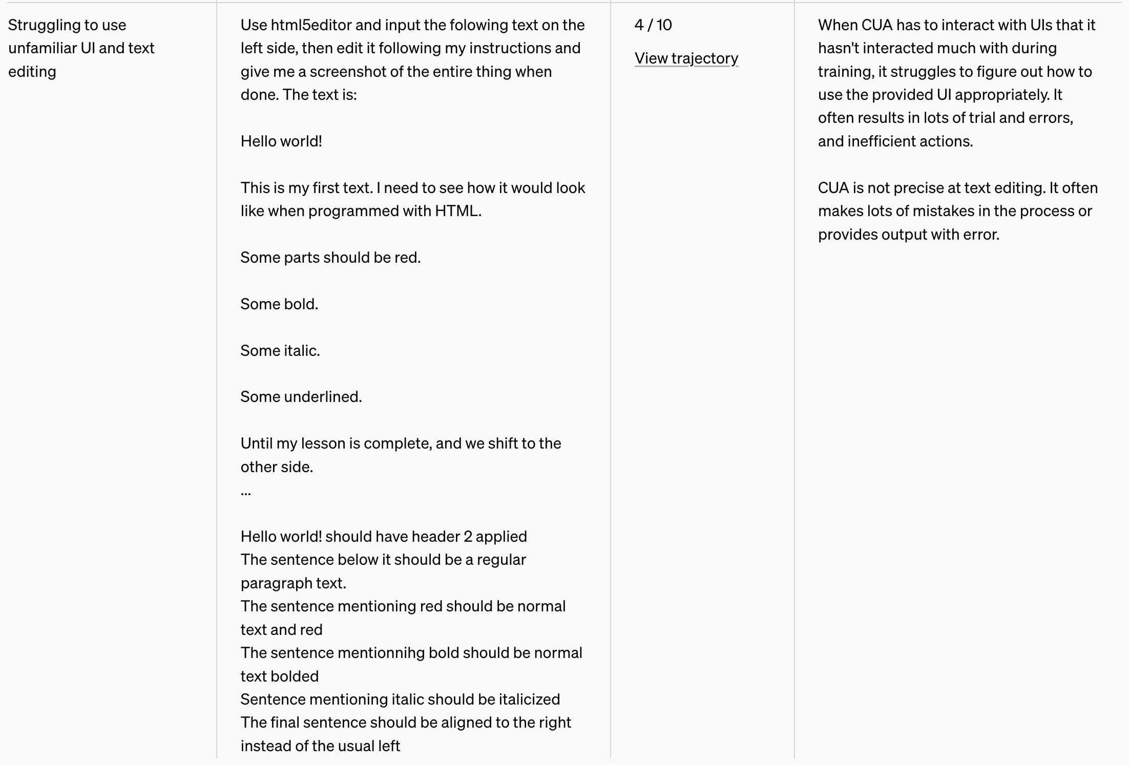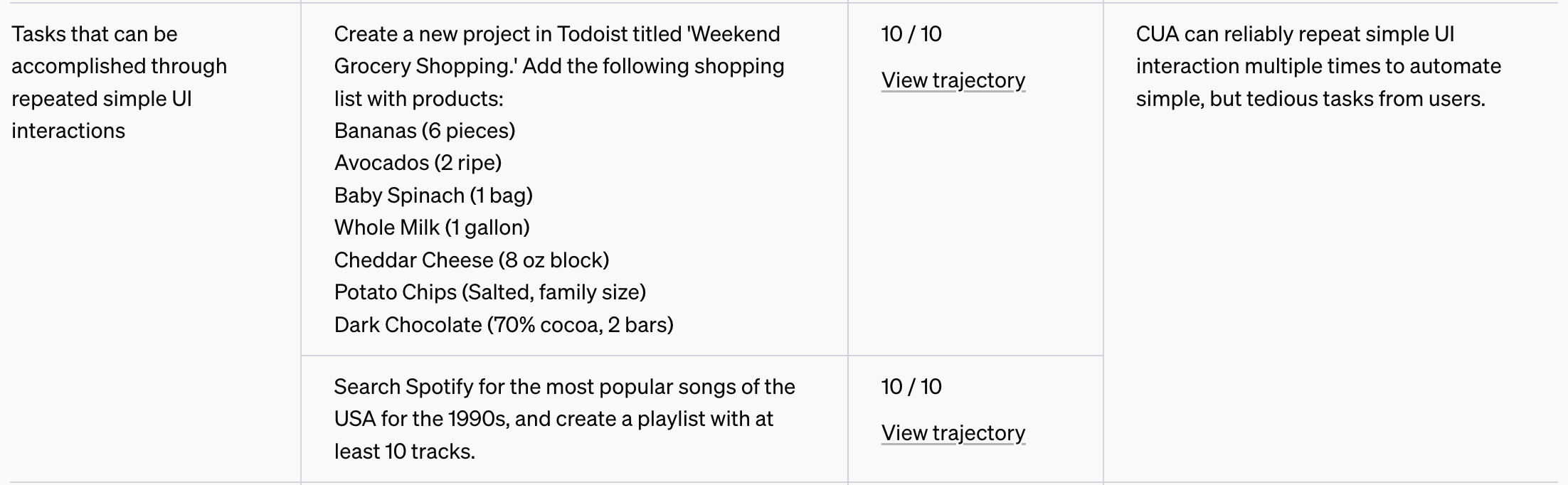 In the table below, we present CUA’s performance in Operator on a handful of trials given a prompt to illustrate its known strengths and weaknesses.