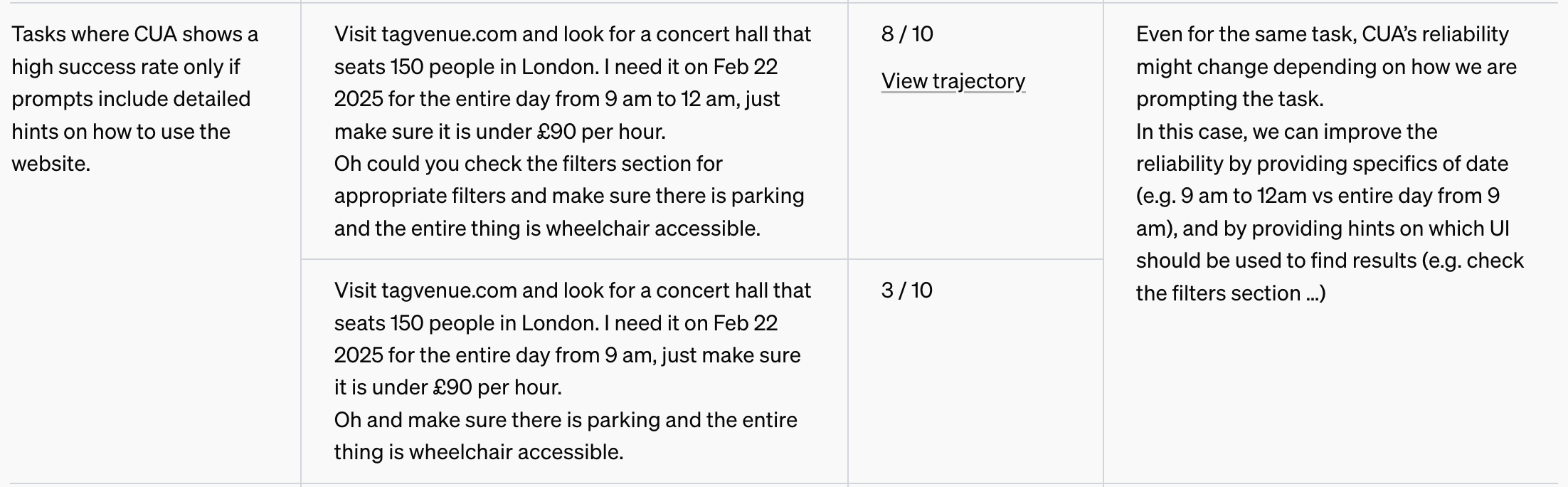 8 / 10 | 即使是相同的任务,CUA 的可靠性可能会因我们如何提示任务而改变。在这种情况下,我们可以通过提供日期的具体信息(例如,上午 9 点到下午 12 点与整天从上午 9 点开始)来提高可靠性,并通过提供关于应该使用哪个 UI 来查找结果的提示(例如,检查筛选器部分…)。 |