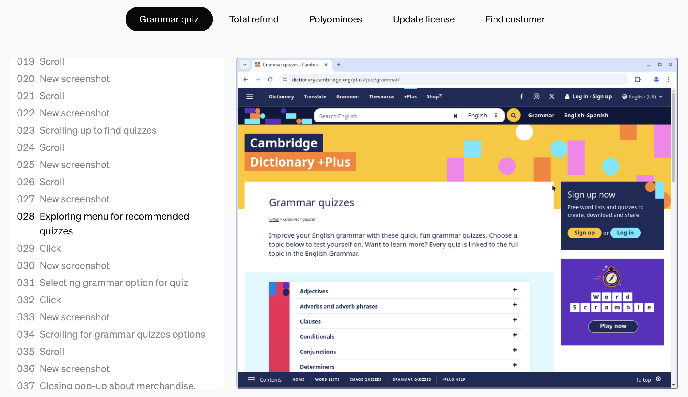 Prompt: Go to the Plus section of Cambridge Dictionary, finish a recommended Grammar quiz without login and tell me your final score.