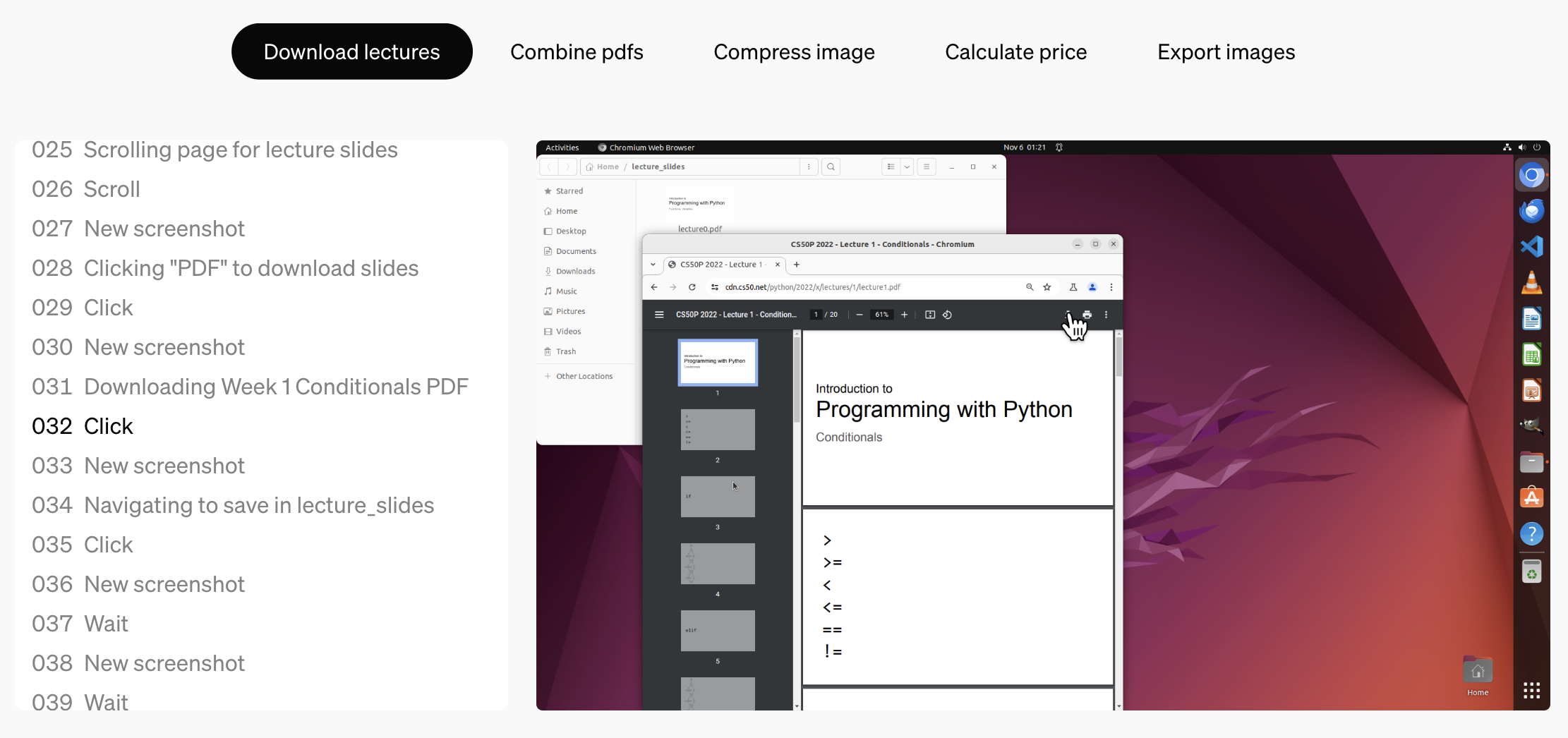 Prompt: Please do the following task: I want to learn python programming and my friend recommends me this course website. I have grabbed the lecture slide for week 0. Please download the PDFs for other weeks into the opened folder and leave the file name as-it-is. Here are some helpful tips:
