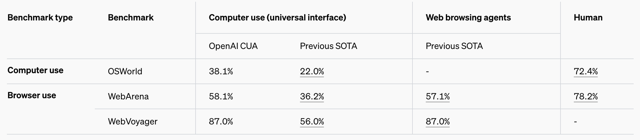 While CUA is still early and has limitations, it sets new state-of-the-art benchmark results, achieving a 38.1% success rate on OSWorld for full computer use tasks, and 58.1% on WebArena and 87% on WebVoyager for web-based tasks. These results highlight CUA’s ability to navigate and operate across diverse environments using a single general action space.