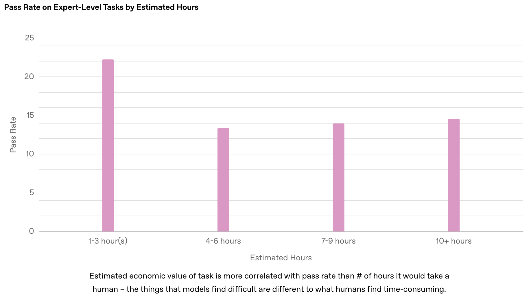 任务的估计经济价值与通过率的相关性比人类需要的小时数更高-模型发现困难的事情与人类发现耗时的事情不同。