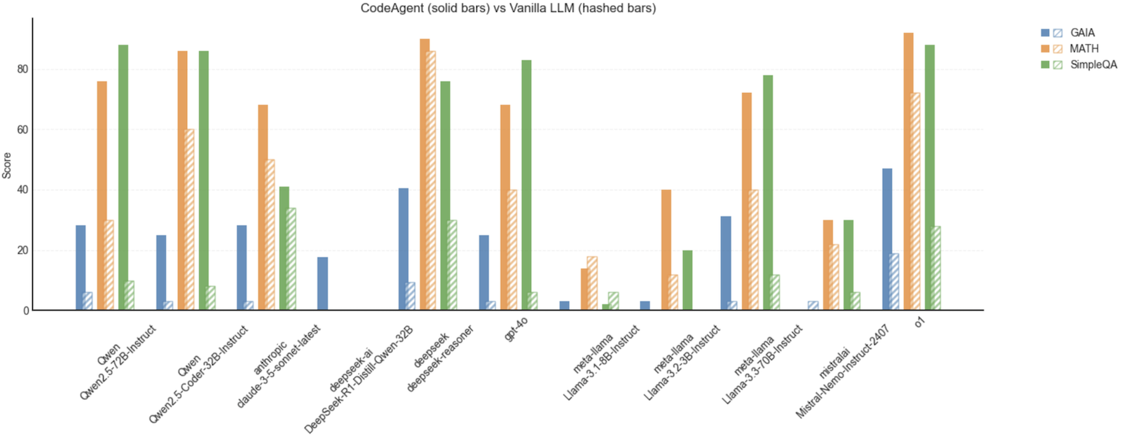 这种性能提升主要是因为让我们的代理以代码形式编写其操作!实际上,当切换到一个标准代理,该代理以 JSON 而不是代码形式编写操作时,相同设置的性能立即降级到验证集上的平均 33%。