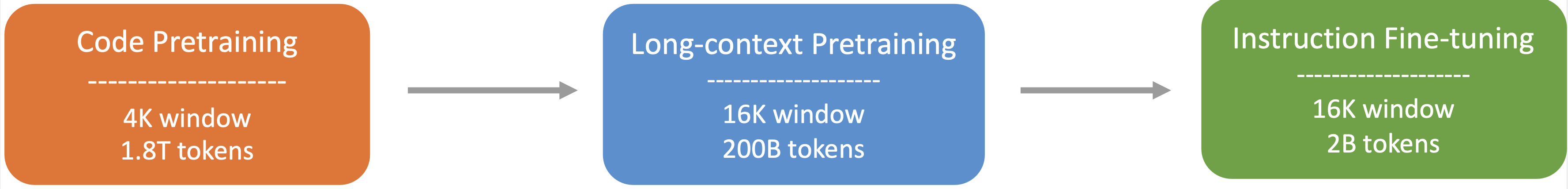 - 步骤 1:最初使用由 87% 代码、10% 代码相关语言(Github Markdown 和 StackExchange)和 3% 非代码相关中文组成的数据集进行预训练。在此步骤中,使用 1.8T 令牌和 4K 窗口大小对模型进行预训练。