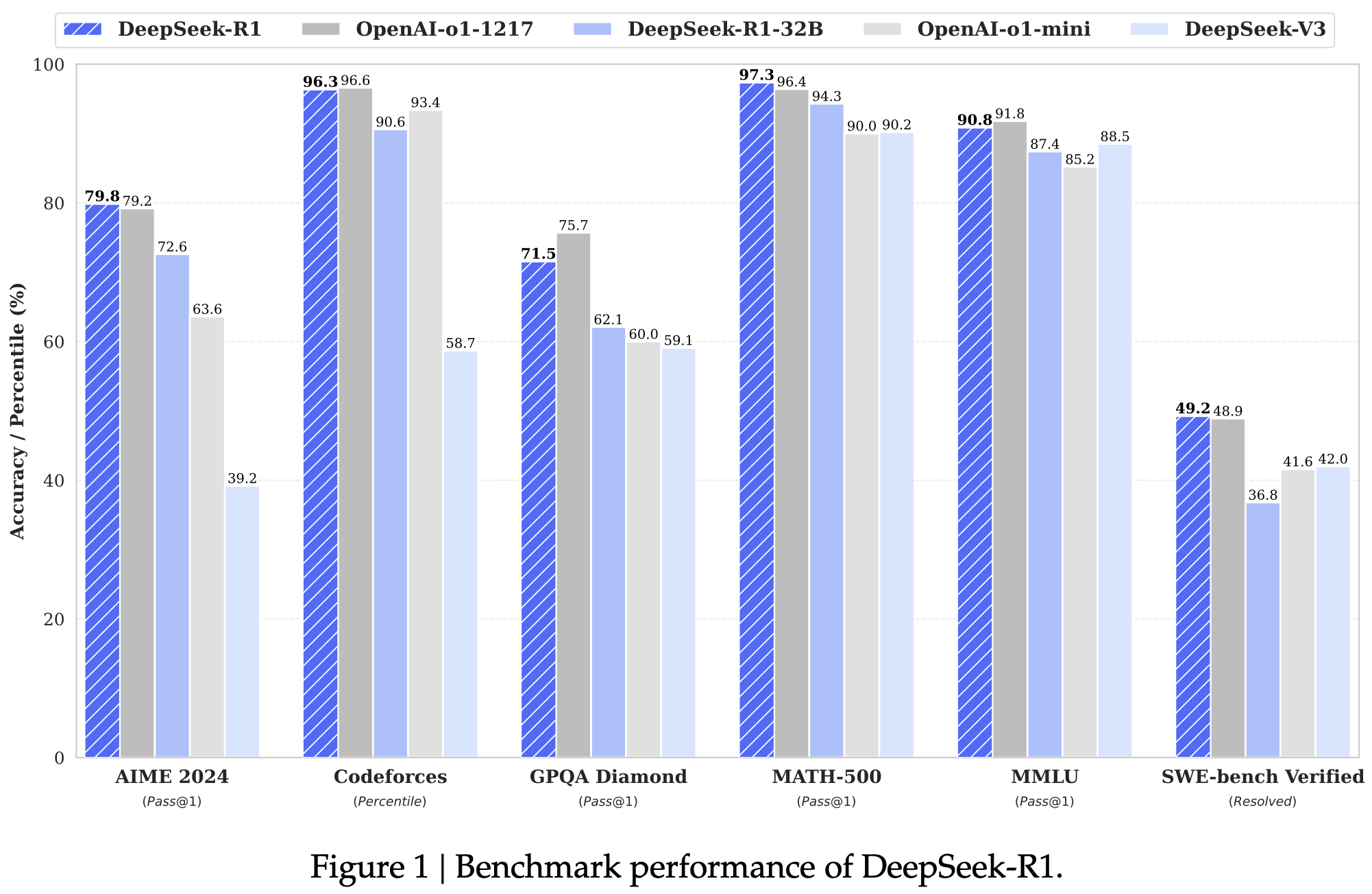 Reasoning tasks: (1) DeepSeek-R1 achieves a score of 79.8% Pass@1 on AIME 2024, slightly surpassing OpenAI-o1-1217. On MATH-500, it attains an impressive score of 97.3%, performing on par with OpenAI-o1-1217 and significantly outperforming other models. (2) On coding-related tasks, DeepSeek-R1 demonstrates expert level in code competition tasks, as it achieves 2,029 Elo rating on Codeforces outperforming 96.3% human participants in the competition. For engineering-related tasks, DeepSeek-R1 performs slightly better than DeepSeek-V3, which could help developers in real world tasks.