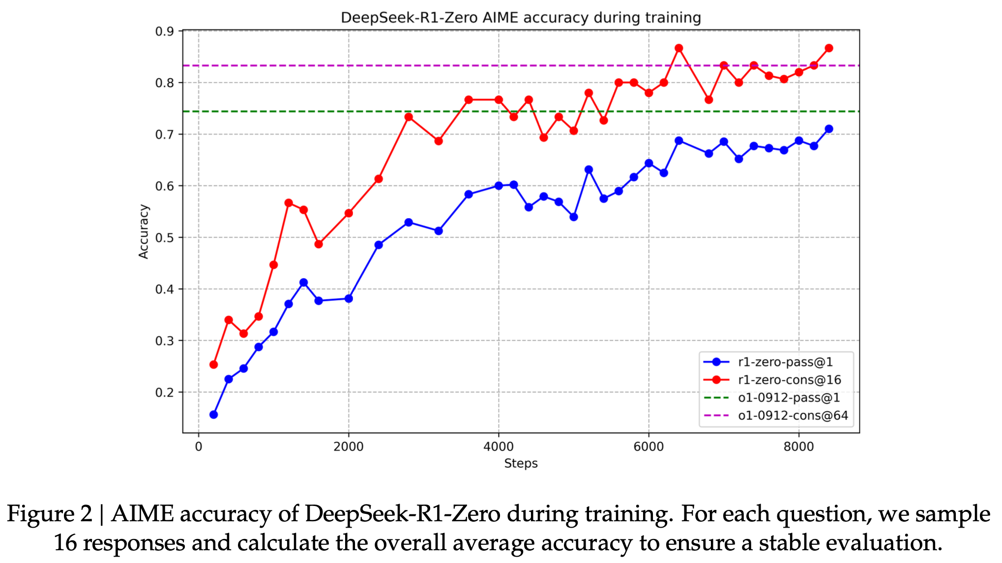 Performance of DeepSeek-R1-Zero Figure 2 depicts the performance trajectory of DeepSeek- R1-Zero on the AIME 2024 benchmark throughout the reinforcement learning (RL) training process. As illustrated, DeepSeek-R1-Zero demonstrates a steady and consistent enhancement in performance as the RL training advances. Notably, the average pass@1 score on AIME 2024 shows a significant increase, jumping from an initial 15.6% to an impressive 71.0%, reaching performance levels comparable to OpenAI-o1-0912. This significant improvement highlights the efficacy of our RL algorithm in optimizing the model’s performance over time.