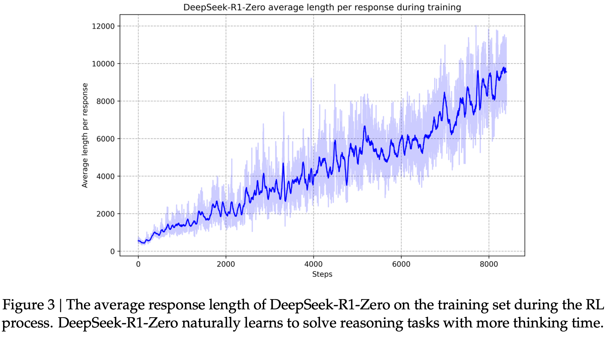 图3 DeepSeek-R1-Zero在RL过程中在训练集上的平均响应长度。DeepSeek-R1-Zero自然地学会用更多的思考时间解决推理任务。