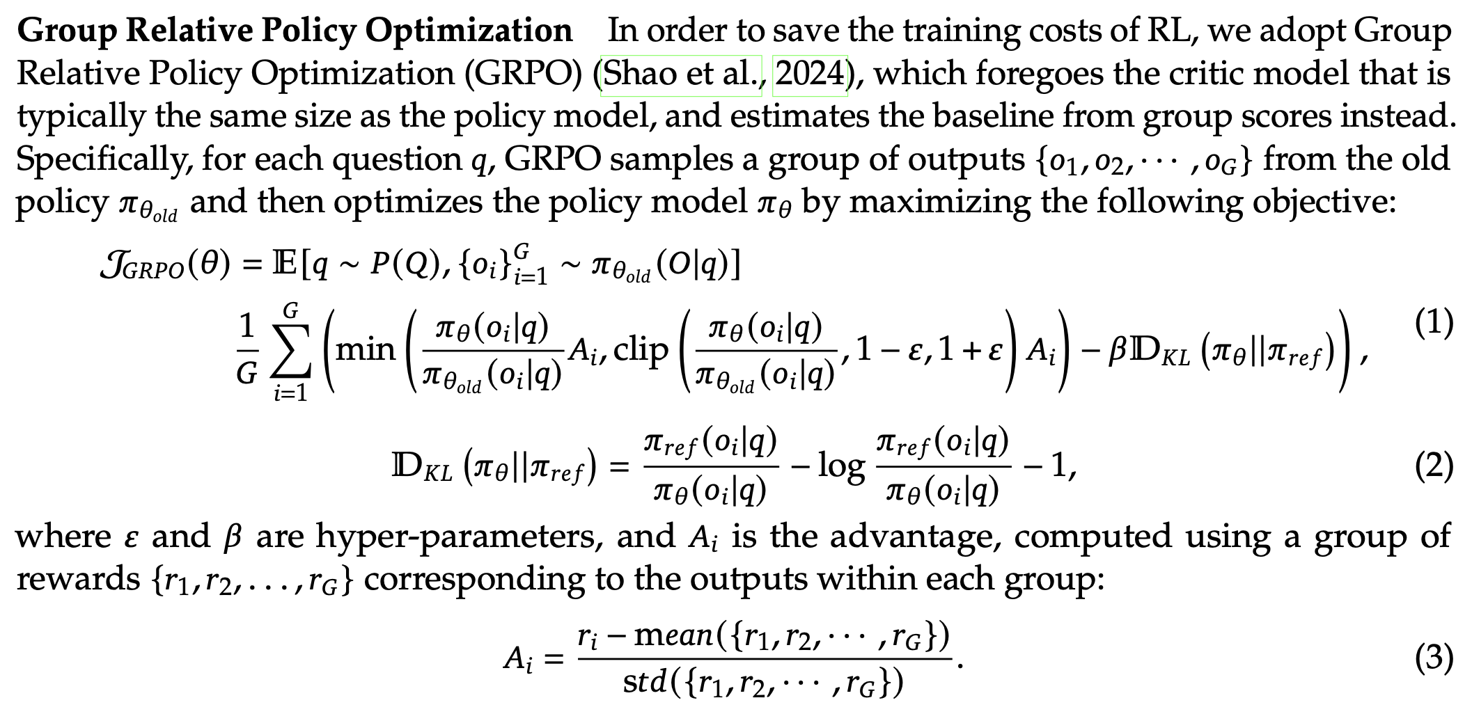 其中𝜀和𝛽是超参数,𝐴𝑖是优势,使用与每个组中的输出对应的一组奖励{𝑟1, 𝑟2, …,𝑟𝐺}计算:
