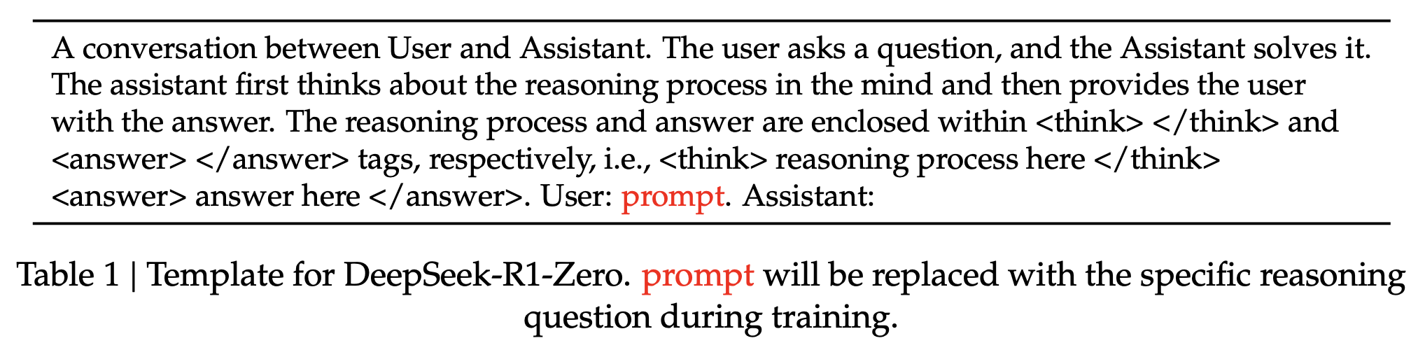 表1 DeepSeek-R1-Zero的模板。在训练期间,prompt将被具体的推理问题替换。