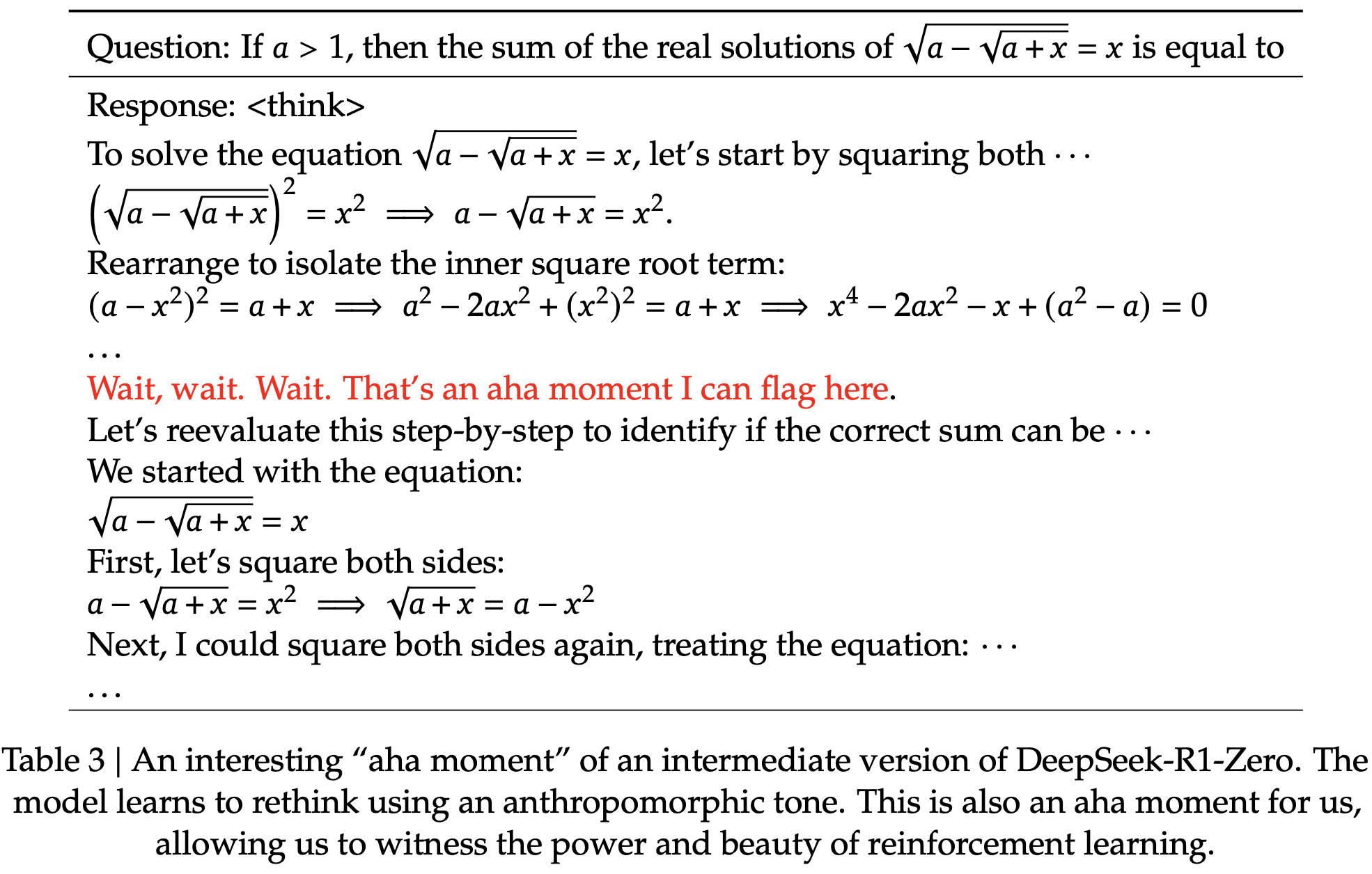 Aha Moment of DeepSeek-R1-Zero A particularly intriguing phenomenon observed during the training of DeepSeek-R1-Zero is the occurrence of an “aha moment”. This moment, as illustrated in Table 3, occurs in an intermediate version of the model. During this phase, DeepSeek-R1-Zero learns to allocate more thinking time to a problem by reevaluating its initial approach. This behavior is not only a testament to the model’s growing reasoning abilities but also a captivating example of how reinforcement learning can lead to unexpected and sophisticated outcomes.