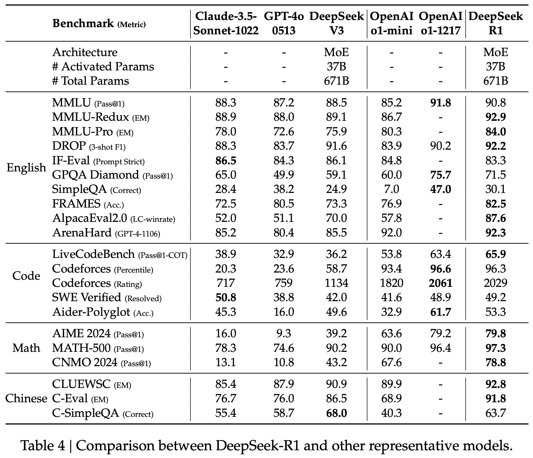 表4 DeepSeek-R1 与其他代表性模型的比较。