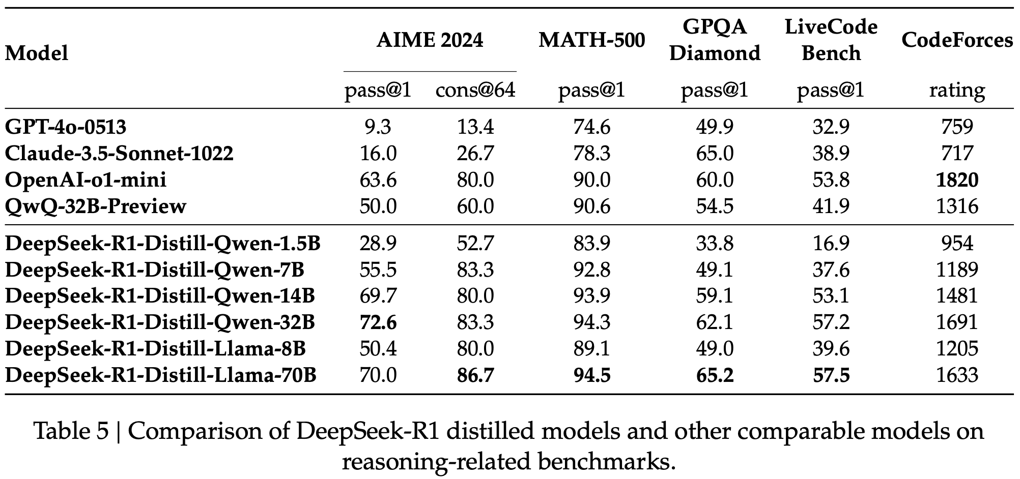 表5 DeepSeek-R1 蒸馏模型与其他可比模型在与推理相关的基准上的比较。