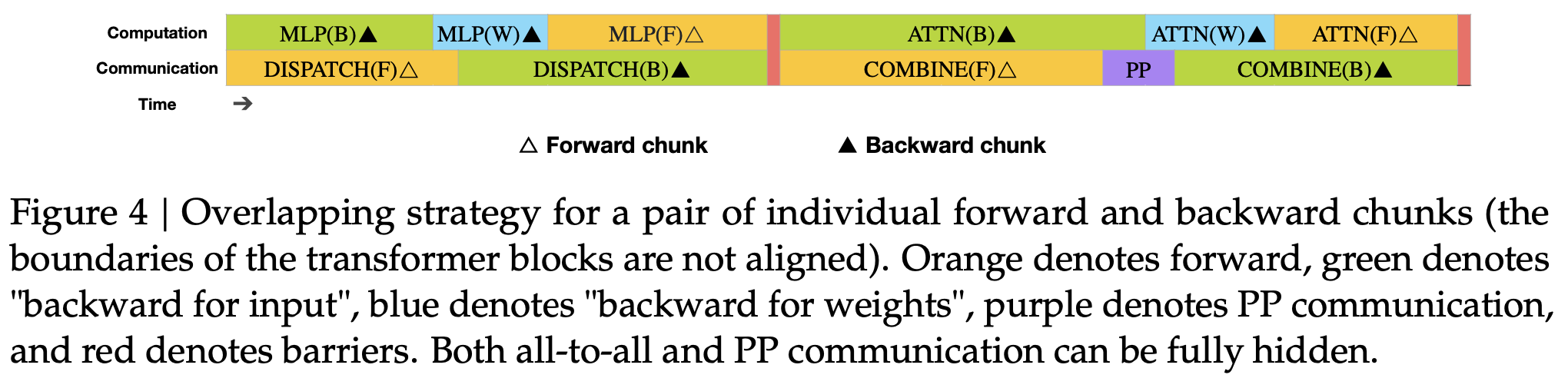 图4 一对单独的前向和后向块的重叠策略(变压器块的边界未对齐)。橙色表示前向,绿色表示“输入的后向”,蓝色表示“权重的后向”,紫色表示 PP 通信,红色表示屏障。全互连和 PP 通信都可以完全隐藏。