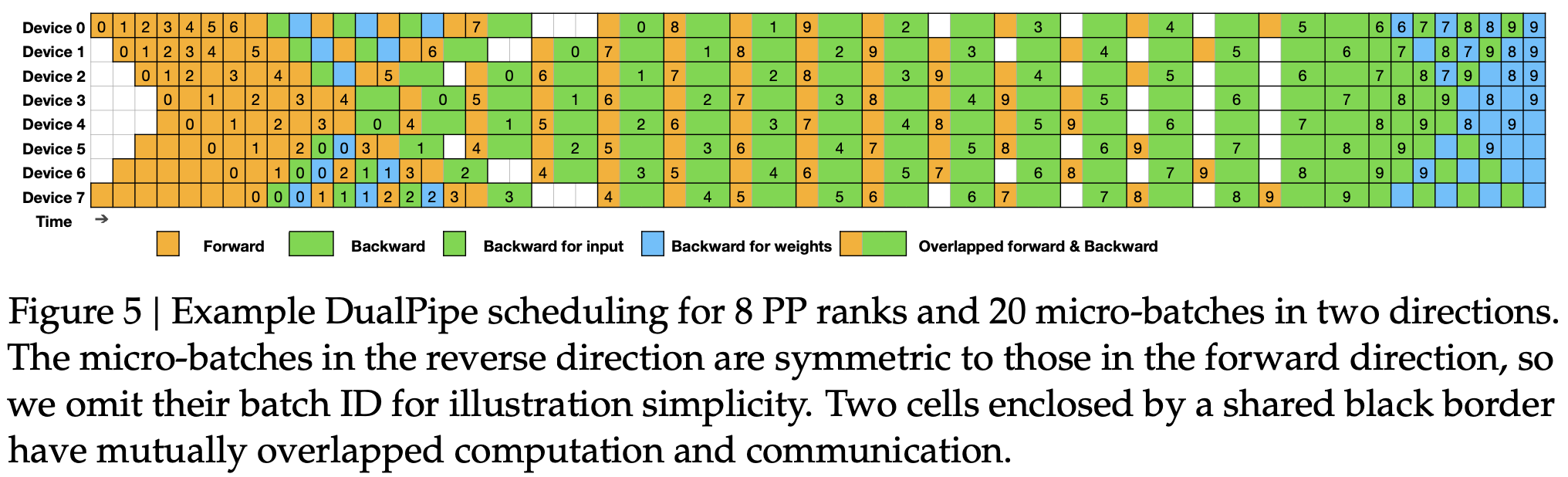 图5 示例 DualPipe 调度,8 个 PP 排名和两个方向的 20 个微批次。反向方向的微批次与正向方向的微批次对称,因此我们为了简化说明省略了它们的批次 ID。由共享黑色边框包围的两个单元格具有相互重叠的计算和通信。